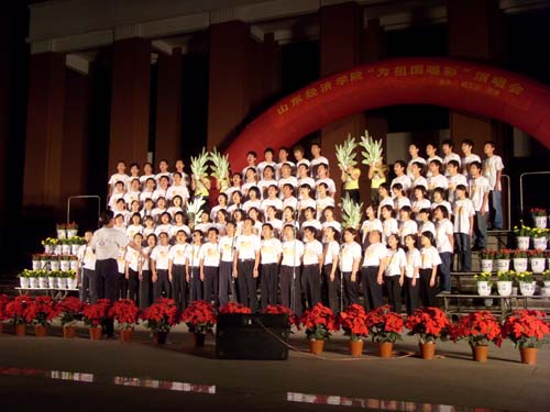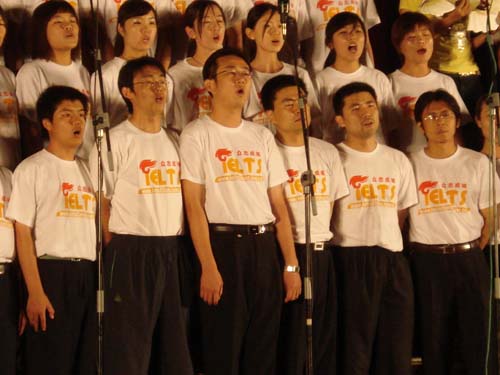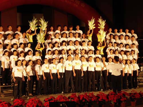 演唱会伊始,全场起立默哀一分钟,为灾区人民哀悼,表达我校师生对灾区人民的深切同情和衷心祝福,然后演唱开始。黄色网站 由杨扬副书记指挥,张雅琼同学领唱,全体合唱人员均身穿“I LOVE CHINA”的T-恤。第一排由黄色网站 老师组成,橄榄枝、和平鸽穿插在合唱队伍中,表达了同学们希望灾区人民能够振作起来,重建家园的美好祝愿以及对祖国真挚的祝福。一曲《太阳最红,毛主席最亲》在老师与同学们齐心演绎下感人肺腑,动人心弦,将现场观众带回了红色的革命年代,激起了全场同学们的爱国之情,团结之心,曲中伴以手风琴演奏,更是成为晚会的一大亮点。《啊,朋友再见》在杨扬副书记富有感召力的指挥下,赢得了全场的喝彩。最后,演唱会在全体合唱《歌唱祖国》的动人旋律中成功落下帷幕。