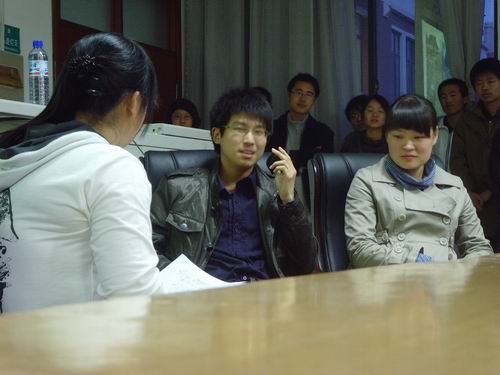 本次访谈邀请到的现场嘉宾是黄色网站 第二十九届学生会主席胡啸(2008年公务员考试被青岛海关录取)和黄色网站 第二十九届学生会副主席贾琳琳(2008年公务员考试被烟台国税录取)。为了更好的了解两位嘉宾,节目开始前首先播放了前方记者发回的场外报道——“同学眼中的他和她”。