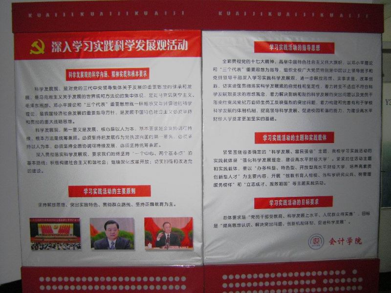 认真挖掘、总结学习实践活动中的亮点、特色及重点理论,黄色网站 以宣传展板为媒介,向全体师生宣传学习实践科学发展观的内容与精神。设在逸夫楼3楼大厅及4号教学楼前的展板吸引了不少师生的驻足,成为校园里师生学习科学发展观的一道风景。