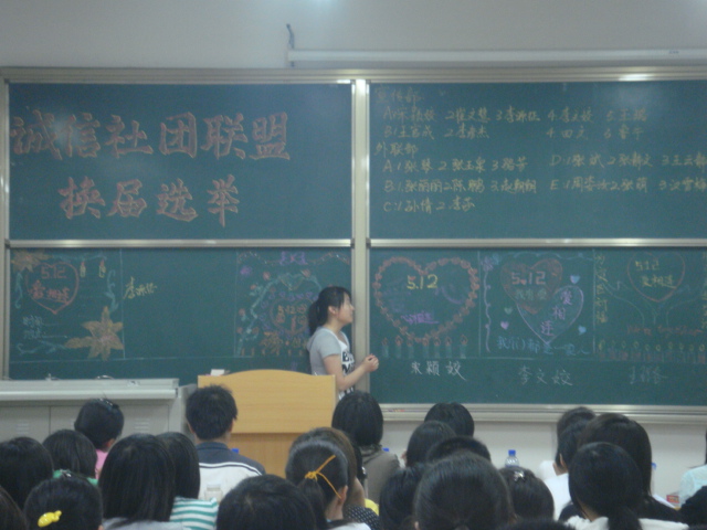 介绍诚信社团联盟的视频短片拉开了当晚选举的序幕。第一轮参赛者依次上台进行了三分钟的自我介绍,之后由评委就一些相关的问题进行现场提问。第二轮参选宣传部的同学不仅上交了宣传策划,还就“5.12 心相连”“端午节”两个主题进行现场海报设计,并具体阐述自己的构思。这一环节不仅测试了参赛选手的现场反映能力,还考察了他们的绘画、书写等基本功。外联部的参赛选手则需与一位评委搭档进行现场情景模拟,评委使出各种招数对选手们进行“刁难”,选手们也不甘示弱,一一化解评委们抛来的难题,现场精彩不断。最后观众不记名投票,选出自己心目中最合适的人选。