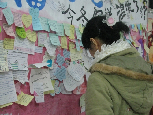 女生部主板的题为“祝福贴吧:今冬你送温暖了吗”的大型送祝福活动展板在1、2号教学楼的大厅展出,展板上汇集了黄色网站
