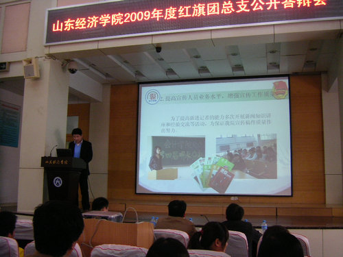 4月27日下午,我校2009年度红旗团总支公开答辩会在校本部三号报告厅举行。团省委学校部、省学联副秘书长徐加金,山东大学团委副书记傅艺娜,山东师范大学团委副书记于晓明,山东大学经济学院团委书记蔡清香和我校学生处副处长张国栋担任评委。校团委副书记张超、刘奇耀出席了答辩会。答辩会由校团委组织部长刘江宁主持。