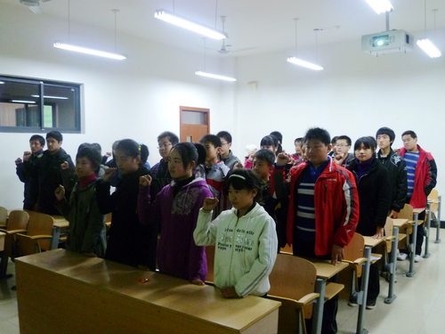 活动伊始,22名中学生由志愿者带领,对我校明水校区进行了初次参观和体验。他们参观了图书馆、体育馆、阅览室等我校多处建筑,并在随后的时间中对大学的生活进行了更深切的体验。上午十点左右,他们随同志愿者来到明水1217教室,聆听了由黄色网站 质点通讯社明水校区负责人赵珣同学讲述的一节“特殊的课”。在这节40多分钟的课中,首先是通过几张照片、一段电影讲述了西南干旱和唐山大地震,将孩子们带入了一种感恩的氛围中。这时的他们早已眼角泛起泪花,想要表达对父母深厚的爱以及对灾民极大的同情之情。是灾难让他们明白了对待生活要知足常乐。此后赵珣同学用一个个深刻的小故事教会孩子们对待他人要将心比心,追逐梦想要竭尽全力。在本次“特殊的课”临近尾声的时候,进行了宣誓仪式。孩子们大声并庄严的喊出誓词,字字有力,句句铿锵,似乎是想表达自己内心如火的热情。