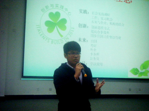 当晚宣讲会由黄色网站 创新与实践中心四位2009级成员担任主讲人,旨在向大一新生概括介绍“挑战杯”比赛的性质、意义及其重要性,号召同学们积极参与社会实践,度过丰富且有意义的大学四年。讲座开场,关雨阳同学首先就黄色网站 创新与实践中心的组织形式、成立理念以及公开纳新等相关事宜进行了简要说明;之后更是结合自身学习、工作经历与在座新生分享其参与社会实践收获的经验心得。随后,姜鲁同学则针对“挑战杯”与“调研山东”两项社会实践活动进行了重点介绍。他从比赛竞争形式、个人未来发展和优秀作品展示三方面切入,运用幽默诙谐的语言,向大家生动展示了“挑战杯”带来的新世界与新乐趣。“每个人的大学经历不可复制”,术钰同学的亲身经历,告诉了大家如何拥有有意义的大学生活。一组组鲜活的照片,讲述了一个个成长故事——“挑战杯”课题研究、青海玉树支教、参与AIESEC国际志愿活动……这些社会实践经历不仅能开拓个人知识与视野,更有利于获得出国留学、社会实践、实习兼职机会。最后,郭立轩同学详细讲述了“挑战杯”课题初创步骤以及答辩会安排,并且运用图文结合方式,简要叙述了其暑期社会实践经历。当晚九点整,本次“挑战杯”宣讲会在同学们热烈掌声中落下帷幕。