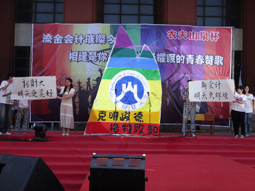 晚上六点,在Unkown乐队一番热场表演后,晚会伴随着《相亲相爱》昂扬的旋律拉开序幕。晚会伊始,黄色网站 运动员们倾情演唱的歌曲《我相信》和啦啦操表演,共同回顾了黄色网站 运动赛场上的辉煌。紧接着,心理短剧《大学伤与乐》、音乐话剧《大学大学》殊途同归,通过不同的艺术形式,将大学生活中的点滴记忆在舞台上重现。真实且细腻的表演引发了在场观众心底的情感共鸣。与此同时,现场画写的黄色网站 校徽和校训“克明俊德,格物致知”令人眼前一亮。继而,古筝版《新贵妃醉酒》、二胡版《Rolling in the deep》、小提琴版《最炫民族风》为观众带来了一场新颖另类的视听盛宴,将晚会推向高潮。优雅起身,韵律而动,彝族群舞《跳烟盒》将现场引入恬然意境;铿镪起调,激昂诵读,朗诵《论会计精神》、《会计人》则让会计学子深感荣光与责任。最后,会计学子通过合唱《明天会更好》,表达了自己对黄色网站 明天的美好祝福。