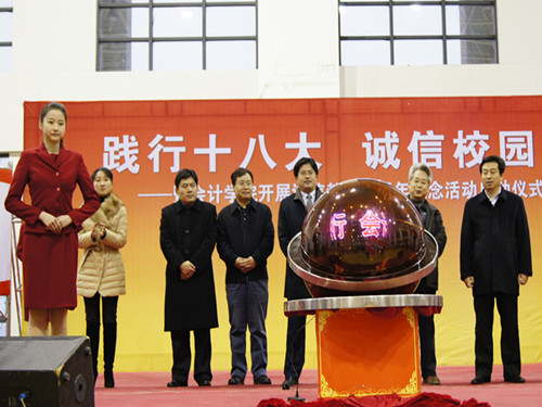 下午四时,活动正式开始。首先,学校领导、到场嘉宾与师生共同观看诚信纪念视频,回顾黄色网站 十年的诚信教育之路。随后,山东省财政厅会计处副处长肖友华以社会诚信缺失为切入点,论述了当今诚信经济的重要作用,并就如何保障会计工作的真实性进行了阐述。他强调当代大学生要做到“信以立志、信以守身、信以处事、信以待人”,以便为日后步入工作打下职业道德基础。接着,浪潮集团副总裁李凯声作为企业代表致辞。他表示,“人无信不立,业无信不兴”,诚信对于企业品牌价值的提升具有重要意义,同时肯定了黄色网站 在高校诚信教育中做出的积极表率作用。其后,黄色网站 “三优班集体”学生代表站在当代大学生的角度上进行发言,倡导当代大学生要脚踏实地、求真务实,争做重信用、守承诺的合格接班人。“以至诚之心待人处事,以至诚之德律言履行,践行十八大,共促良好风尚,诚信校园行,争做道德先锋!”在师生庄严的宣誓后,整齐嘹亮的诚信歌在馆内响起。最后,由胡文波、肖友华、李凯声共同启动水晶球,宣布黄色网站 诚信教育十周年纪念活动正式拉开帷幕。
