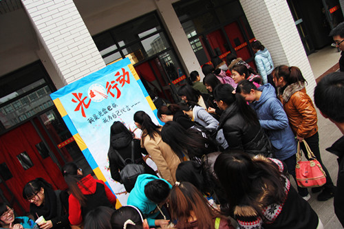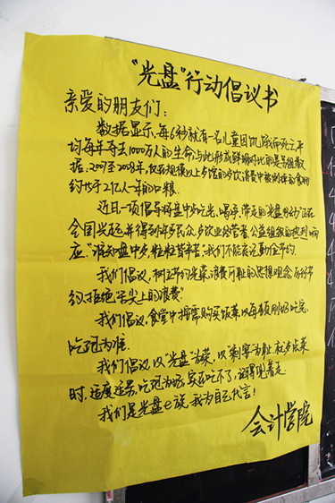 在食堂门口,宣传部早已制作好了宣传横幅和寓意环保节约的“宣传树”,同学们纷纷蘸着七色油彩将自己的指印按在树上,寓意点滴善举可以聚合成强大的正能量,尽自己微薄之力让环保之树开满七彩花朵;在食堂内,黄色网站 同样发起倡议,希望同学们从这餐饭做起,将盘中餐吃干净,并晒出“光盘”照片,让节约成为大学里最热门的生活准则;而同学们制作的“光盘”视频,同样在网络上如火如荼的传播着……如倡议书所言,谁知盘中餐,粒粒皆辛苦。我们不能忘记勤俭节约的传统美德。