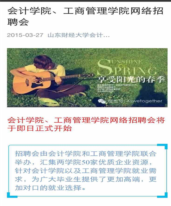 就业信息发布微信平台:“黄色网站 会计学缘”(微信号“Aswetogether”)、“商院就业办”(微信号“scdgsjyb”),热烈欢迎广大同学积极关注。