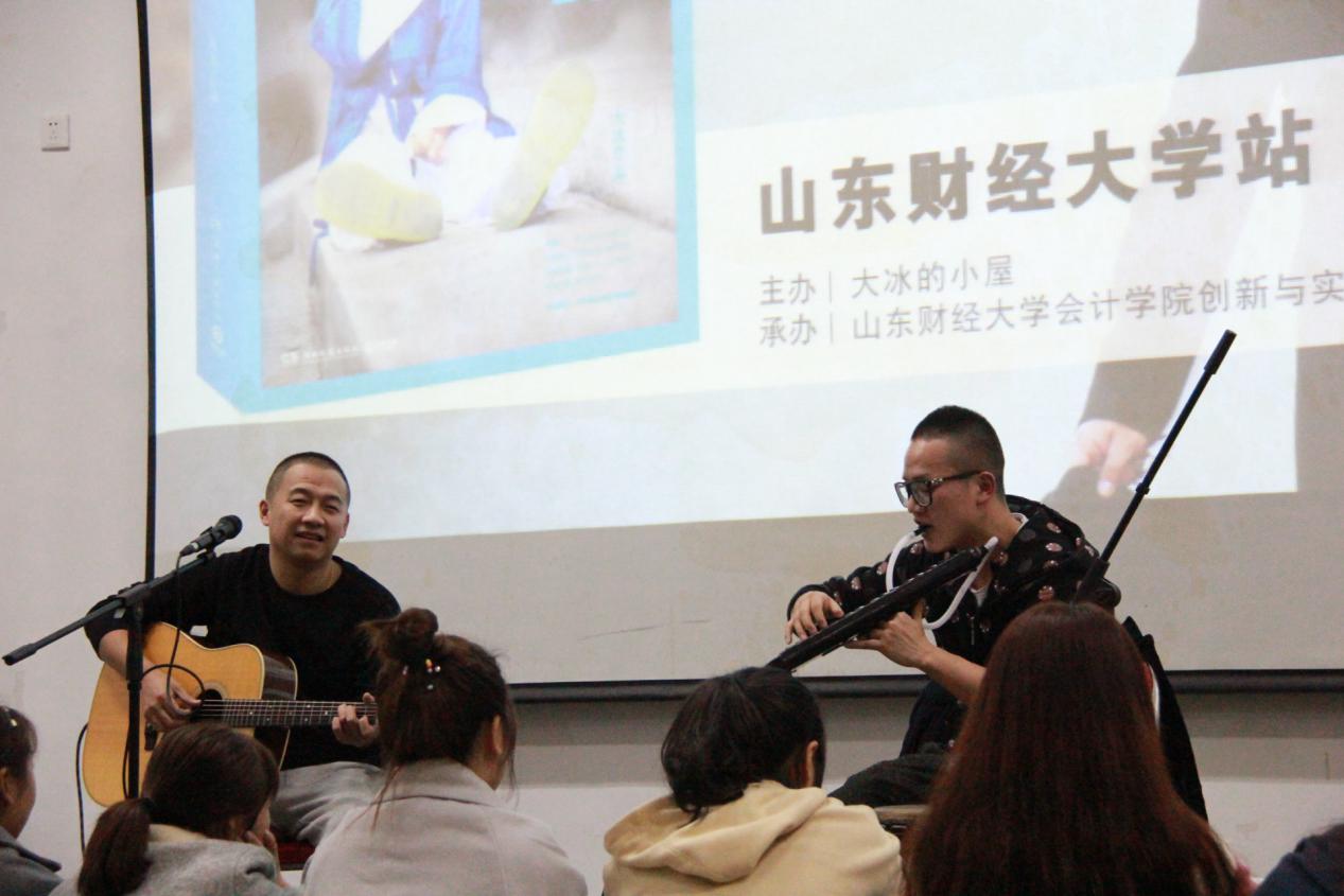 下午六点的章丘夜色如墨,寒风冷雨。但同学们依然早早地来到现场,在工作人员的帮助和引导下,有序地进入了5201教室,默契地等待果子和毛毛的出场。六点三十分,在主持人简单的开场白之后,《最后一个义工》主人公原型——90后大男孩果子,和《木头马尾》主人公原型——自称“70后老男人”的毛毛在同学们的掌声中登场。像在大冰的小屋那样,他们邀请了一些同学围坐在舞台上,边弹边聊边唱。