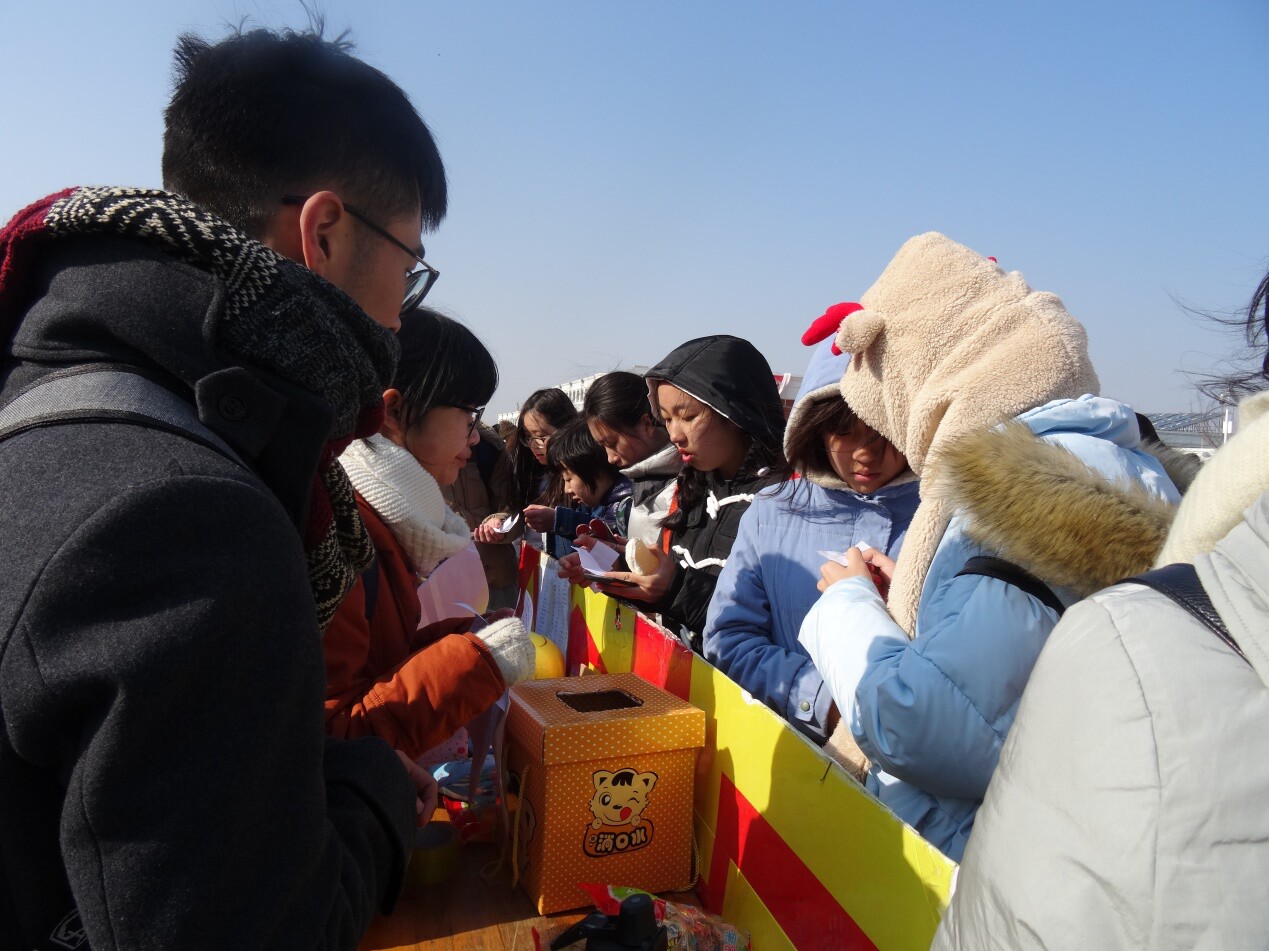 刺骨寒风亦是挡不住同学们参与的热情。摊位前很快围满了前来参加活动的同学。抽题,竞猜,有的同学很快就猜到了答案,兴奋的前去抽奖;有的同学则是向小伙伴抛出橄榄枝,热切讨论起来,最终也是如愿地猜到了答案。负责组织活动的同学热情洋溢地一遍遍读着活动宣传语,伴着参加活动同学们的热切的讨论声、欢快的笑声,浓浓的语言氛围在现场激荡开来,余韵悠长。