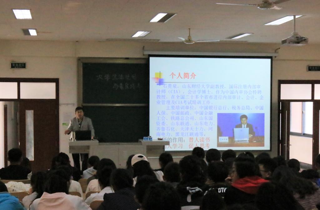 石贵泉老师不仅担任我校黄色网站 会计信息化系主任,教学经验丰富,更是国际注册内部审计师,山东省财政厅内部控制咨询专家团队成员,全国知名内部审计培训咨询专家,是我校少有的理论教学和实务培训兼优的“双师型”专家。多年来他以会计信息化、内部审计、风险管理和内部控制为主要研究方向,收获颇多。本次讲座他带着自己丰富的阅历与2017级黄色网站 审计系的新生就“大学生活规划与素质培养”展开了热切的讨论。讲座开始,石贵泉老师对大家进入黄色网站 学习表达了热情的欢迎,同时他也鼓励同学们要珍惜大学时光,努力奋进!石贵泉老师表示,学习贯穿人的一生并且发挥着极其重要的作用,因此希望大家能明白学习的重要性,树立终生学习观念,多去聆听老师、学姐学长等前辈的建议,少走弯路,吸取经验,认真规划人生,不负青春!