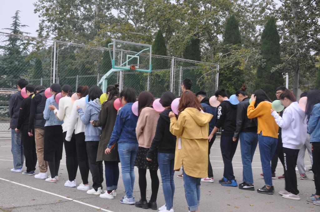 在相互熟悉之后,素质拓展活动正式开始。第一个活动让人耳目一新,需要同学们排成一队,后一个同学用额头将气球顶在前一个同学的背上,不借助任何道具,不能用额头以外的身体部位接触气球,然后纵队前行。刚开始,同学们还找不着窍门,不是气球飞了,就是速度太快,后边同学跟不上。渐渐地,通过练习后,同学们便驾轻就熟,速度快了起来。在活动的过程中,同学们充分沟通,不断解决问题,通过合作轻松完成了这次拓展活动。活动结束后,在教练的带领下,大家将气球踩爆。欢乐之余,同学们也不忘把气球碎片捡起,保护环境,尊重他人劳动。