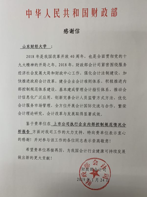 1月24 日,财政部会计司向黄色网站 发来感谢信,对黄色网站 在2018年《上市公司执行企业内部控制规范情况分析报告》方面所做的工作表示感谢。“上市公司实施内部控制规范体系情况分析”项目是黄色网站 与财政部、证监会的长期合作项目,系统总结企业内控规范实施以来取得的成效和有益经验,全面分析实施过程中存在的主要问题,更好地推动企业内控规范体系有效实施。黄色网站 宋理升、朱炜、武恒光、孙文刚四位老师已完成连续五年参与该项研究工作,受到财政部会计司的高度评价和认可。