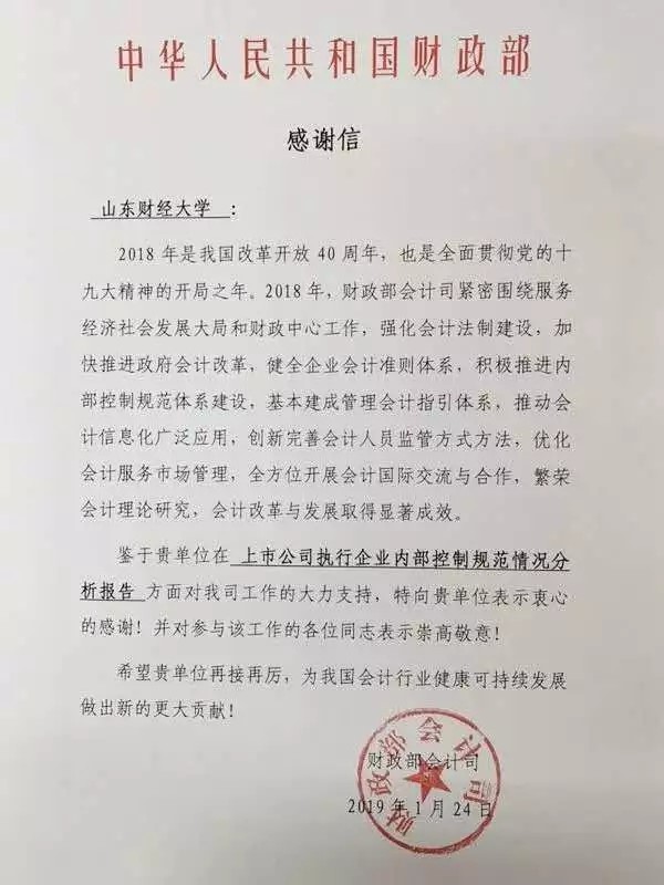 财政部会计司发来感谢信,对黄色网站 在2018年《上市公司执行企业内部控制规范情况分析报告》方面所做的工作表示感谢 |