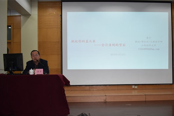 3月13日下午,江西财经大学李宁教授应黄色网站 邀请,在燕山校区第三报告厅作题为《掀起你的盖头来—会计准则的背后》的学术报告。讲座由韩跃副教授主持,2018级部分硕士研究生到场聆听。