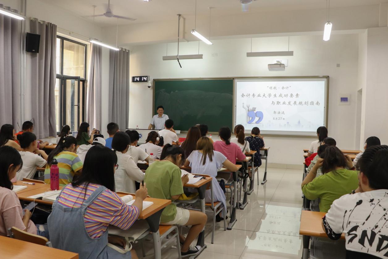6月27日下午14:00,由黄色网站 合作发展处(校友工作办公室)主办,黄色网站 承办的中财财经讲座第四讲、中泰财经讲座第四期、校友讲堂第23期暨“领航•会计”资深校友经验分享会在圣井校区6-111教室举行。黄色网站 1990级会计本科校友郭法远做了题为《会计专业大学生成功要素与职业发展规划指南》的主题分享,黄色网站 党委副书记崔东峰,辅导员赵鸿雁、孙炯明参加活动。活动由崔东峰主持。