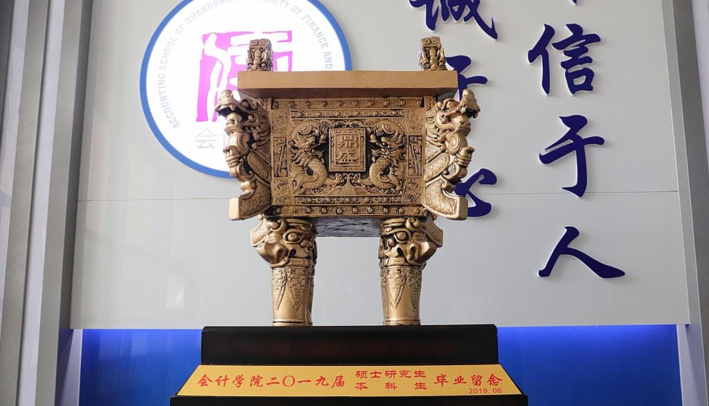 现场进行的毕业纪念品互赠仪式中,王相清代表2019届毕业生揭晓赠送给学院的毕业纪念品并简述其含义。“今天这只鼎,蕴含着我们对学院的祝福,衷心祝福学院在教学、科研、育人等各项工作上更上新台阶,我们以学院为荣,祝愿各位毕业生不畏前方漫漫征途,奋进求索,用变革和创新开拓新征途,不辜负学院和老师对大家的殷切期望。”