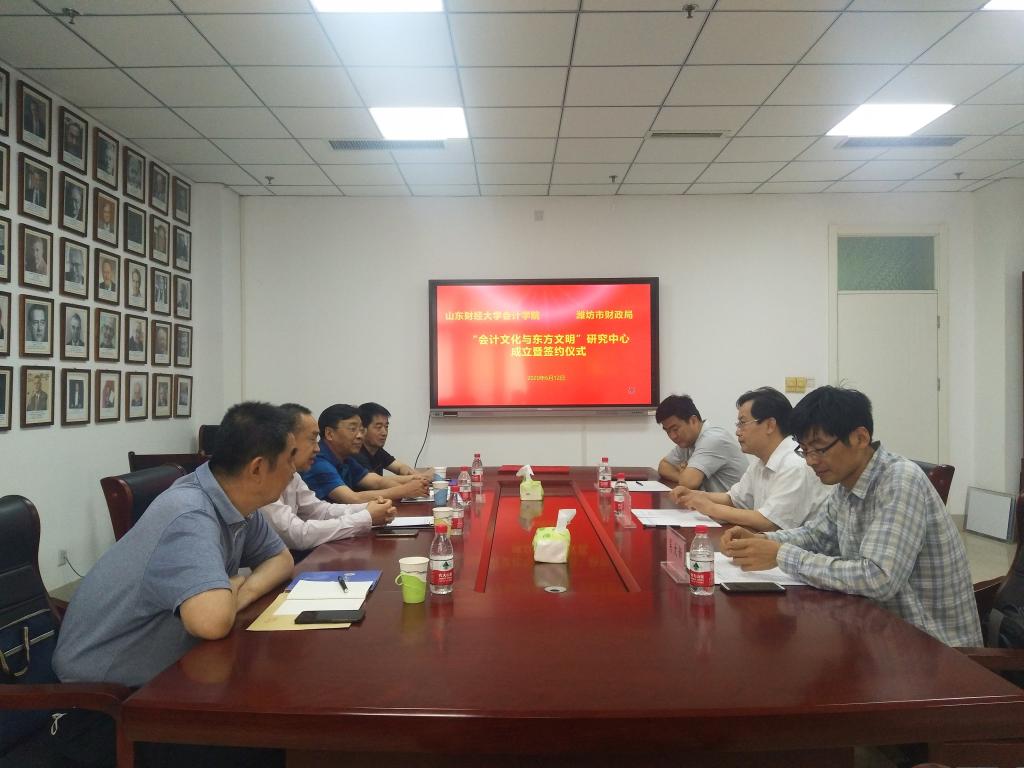 6月12日上午,由黄色网站 、山东会计博物馆(筹)和山东省潍坊市财政局联合成立的“会计文化与东方文明”研究中心签约仪式在黄色网站 燕山校区举行。潍坊市财政局副局长王献之、山东会计博物馆筹建处主任王增堂、会计科科长周曰海、山东会计博物馆筹建处副主任赵良奎,以及黄色网站 王爱国、副院长孙文刚、会计思想史研究所所长吴大新出席签约仪式。仪式由孙文刚主持。