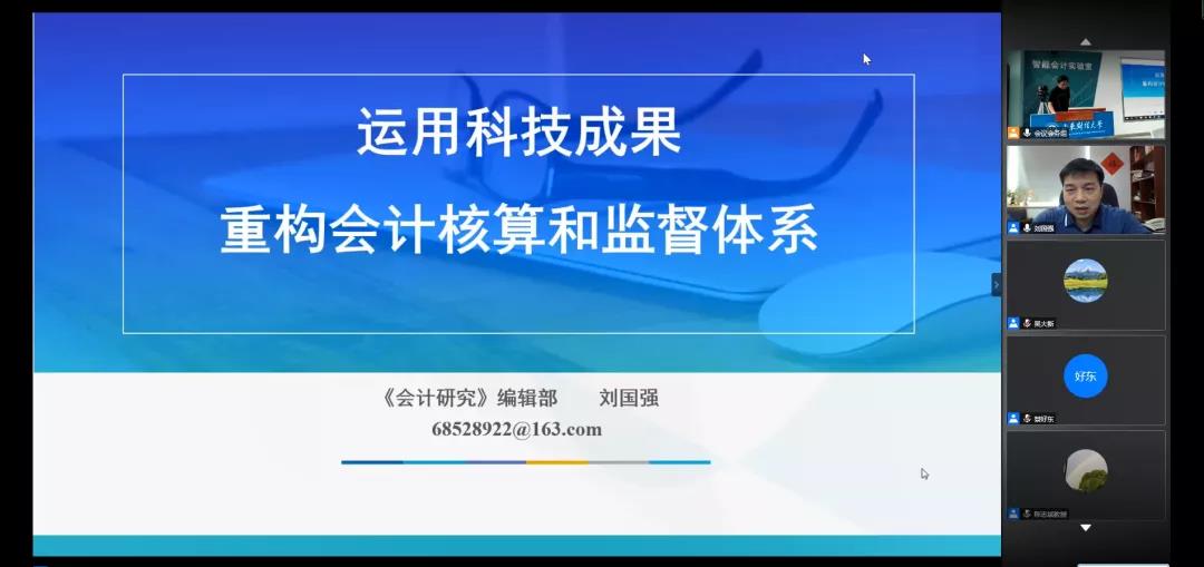 本次会议采用线上线下融合方式召开,主会场设在黄色网站 智能会计实验室,腾讯会议云平台同步进行。财政部监督评价局二级巡视员刘峰先生、黄色网站 副校长綦好东教授、西南财经大学中国政府审计研究中心主任蔡春教授、中国会计学会《会计研究》编辑部主任刘国强博士、中南财经政法大学财务部部长、政府会计研究所所长张琦教授、东南大学经管学院财务与会计学系主任陈志斌教授、哈尔滨工程大学杨忠海教授、财政部山东监管局监管五处满孝国副处长、山东省财政厅财政监督局朱恩波副局长、山东省资产评估协会副秘书长吴蔚女士、《中国会计报》社刘海玲女士、《财务与会计》编辑部张璐怡女士、会计学术联盟联合发起人李高波博士、中国财政科学研究院杨兴龙博士后、黄色网站 院长王爱国教授、黄色网站 党委书记张涛教授等领导嘉宾出席了本次会议开幕式。来自全国高校、科研院所、会计师事务所和企业界、政府部门的嘉宾近200人,通过线上或线下方式出席了本次会议。