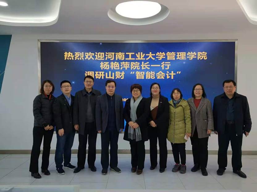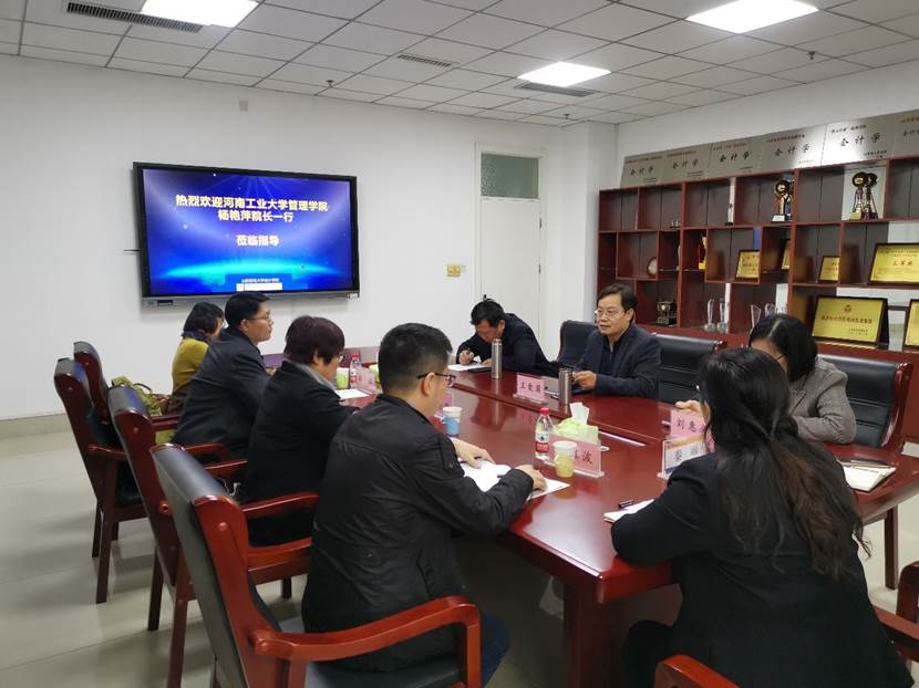 王爱国首先对远道而来的客人表示欢迎。他说:河南工业大学的前身是郑州粮食学院,是共和国历史上著名的粮食行业“黄埔军校”。当前,粮食安全是维护国家安全的重要基石,党和国家对保障我国粮食安全提出了新的要求。在“粮食安全”上升为国家战略的政策背景下,河南工业大学管理学院基于粮食管理,围绕粮油电商、期货和物流管理,开展智能会计尤其智能会计核算和智能成本与管理会计的人才培养和科学研究更具优势、更能形成特色,在粮食生产、仓储和交易由机械化向生态化、智能化转型中会更好发挥会计的作用,期待着在这些方面开展与河工大管理学院的全方位合作。同时,王院长向客人详细介绍了智能会计发展中的“山财模式”。