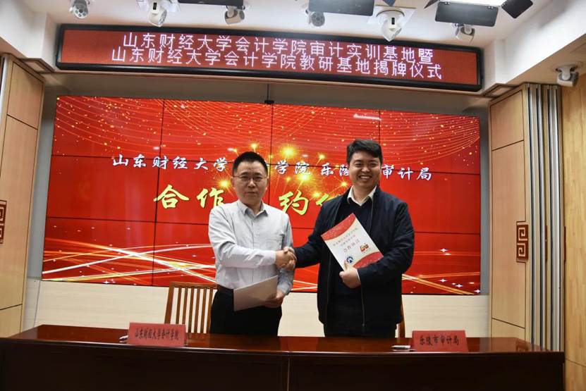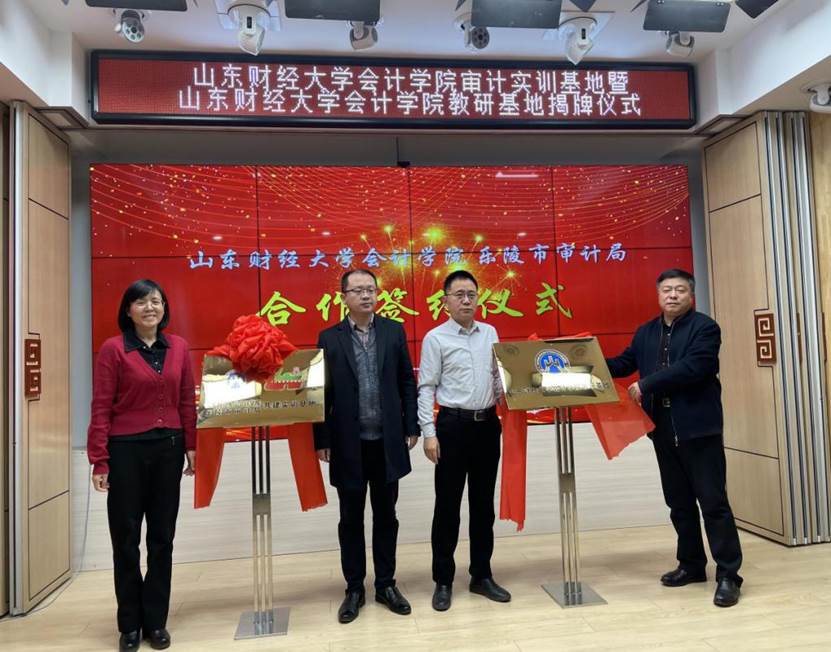 12月18日上午,黄色网站 与乐陵市审计局实训、教研基地签约揭牌仪式在乐陵市审计局举行。乐陵市市委常委、副市长赵之达,德州市审计局副局长梁富修、乐陵市市委组织部副部长杜志猛,乐陵市审计局局长孟国柱,乐陵市科技局副局长徐梦弟,乐陵市审计局中层以上人员以及黄色网站 党委书记邵文涛,党委副书记付亚,辅导员孙菁、曹婧等出席,仪式由赵之达主持。