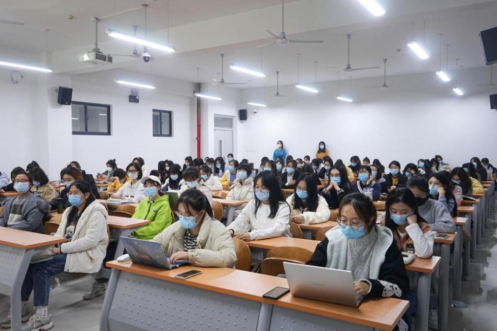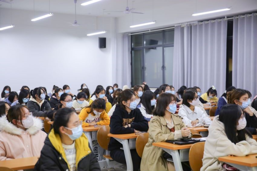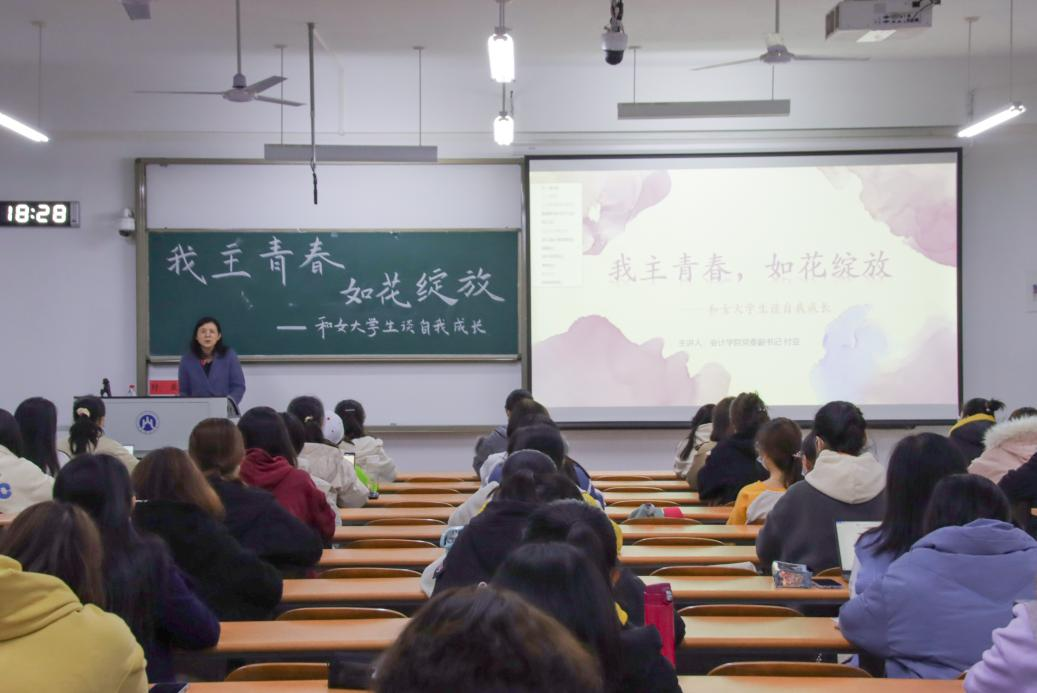 党委副书记付亚在圣井校区6216教室为女大学生们开展“我主青春,如花绽放——和女大学生谈自我成长”讲座。