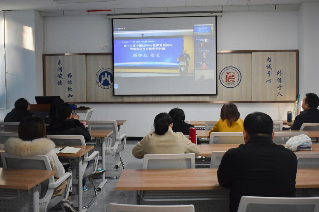 随后,各位老师共同观看了线上论坛。首先,江苏大学校长颜晓红致开幕词。颜晓红向各方对江苏大学的支持表示感谢,并表示此次论坛对进一步推动MPAcc教学案例研究与开发、提高案例教学质量、促进教师之间的经验交流具有重要意义。随后,全国会计教指委副主任委员兼秘书长、中国人民大学商学院王化成教授介绍了全国MPAcc教育发展状况,并指出案例教学的生态系统建设应包括“写、教、学、赛、建”,应将真实案例与学生的学习密切结合。