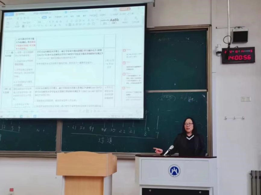 王斌和刘明辉分别向同学们介绍了研究生学习和生活方面的内容,王斌建议同学们认真完成课程学习,以建立专业思维方式和知识体系,并鼓励同学们要积极主动地与导师沟通交流,充分了解相关研究领域,做好学业规划。刘明辉则向同学们简要说明了研究生教学管理系统的功能和使用方法,以及黄色网站 在导师选择和课程选修方面的相关要求,她建议同学们善用、活用研究生教务管理系统,及时关注发布的最新消息。