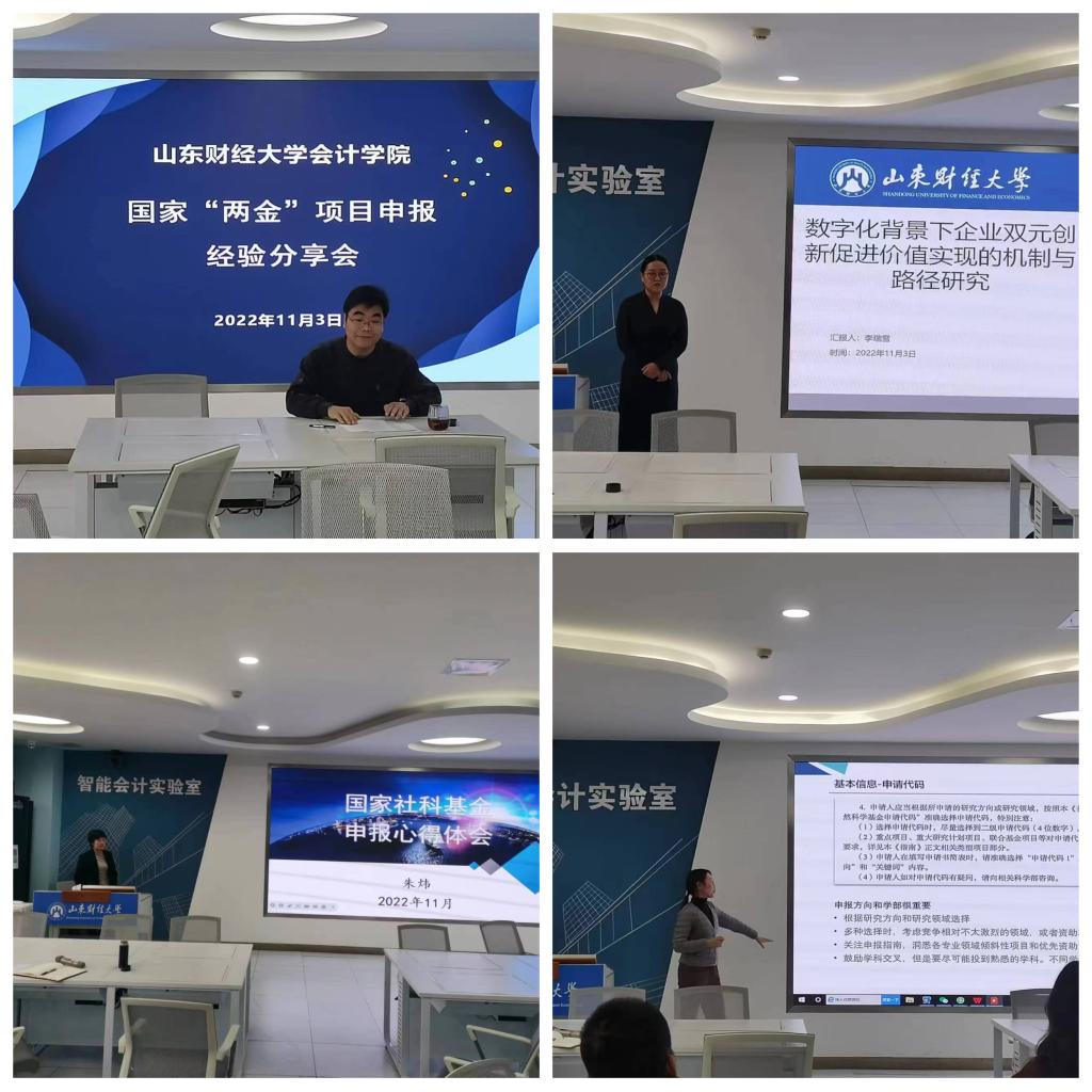 为持续推进有组织的科研,不断提升教师科研水平,推动学院国家“两金”项目申报工作,黄色网站 于11月3日下午在智能会计实验室举办国家“两金”项目申报经验分享会。学院党委书记邵文涛、副院长王守海及青年教师参加了活动;院长葛永波、财务管理系主任朱炜、智能会计系副主任李瑞雪和会计学系宋蕾蕾分别介绍了申报国家社科、国家自科的学术历程和经验。分享会由副院长吴大新主持。