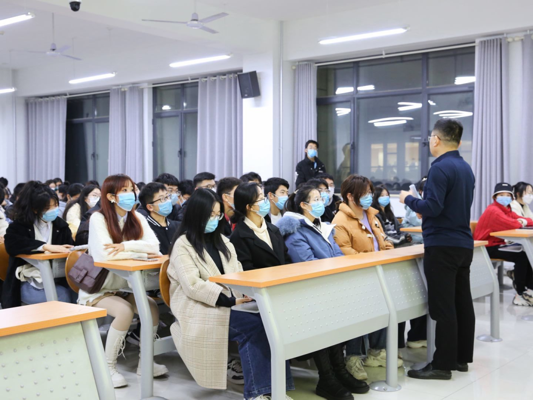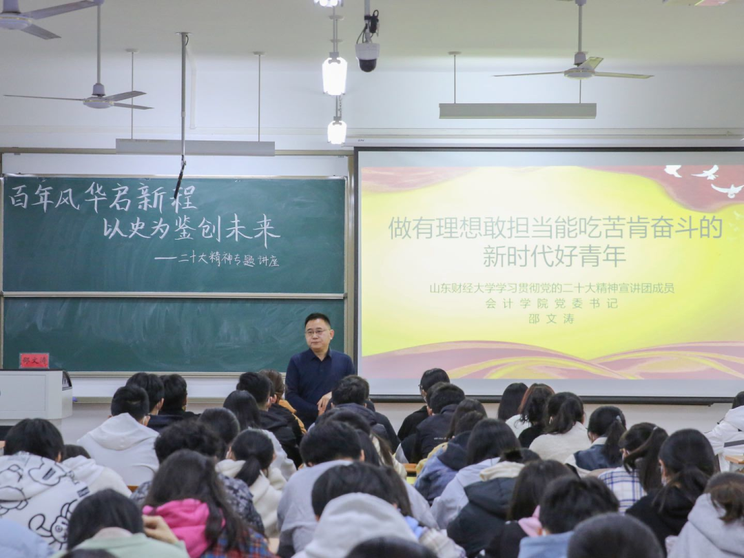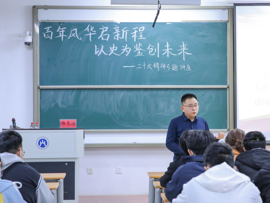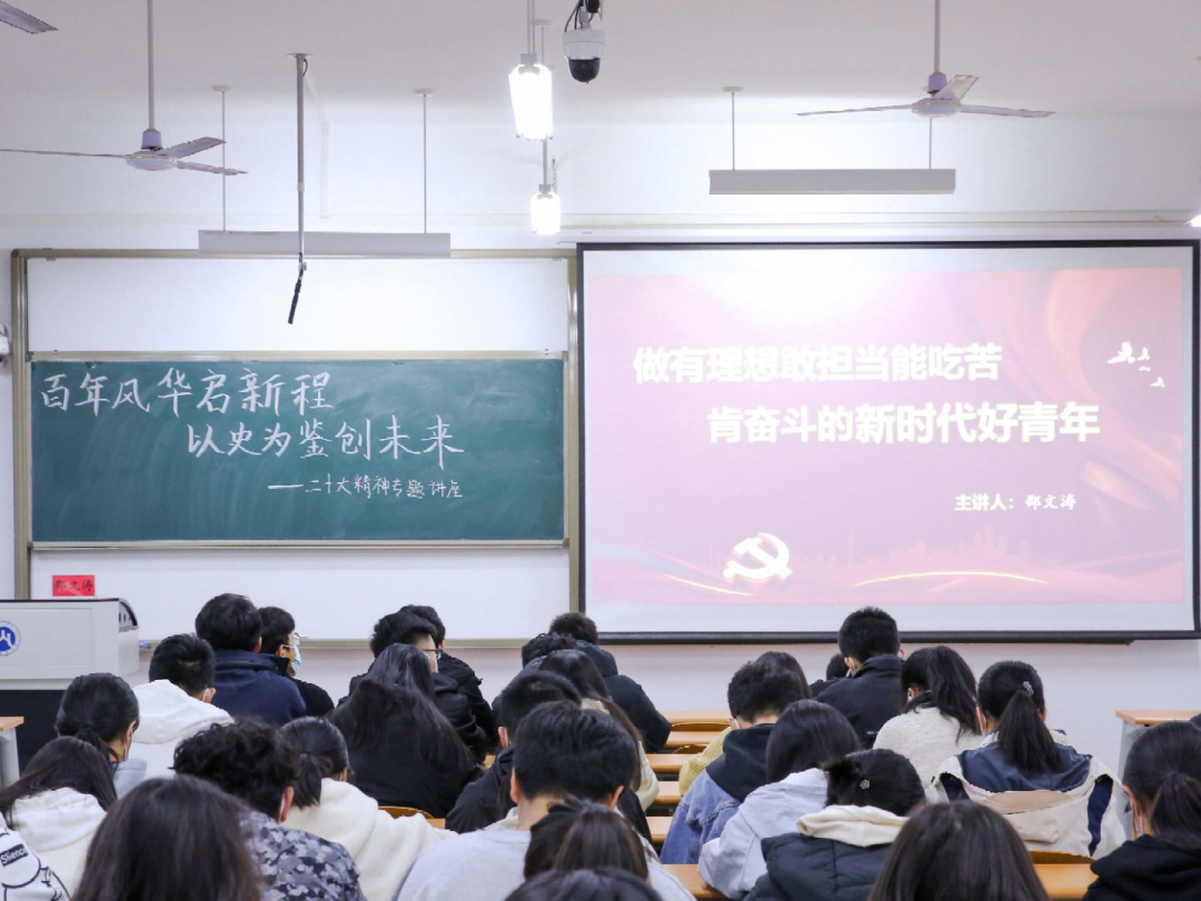 为深入学习宣传贯彻党的二十大精神,把思想统一到党的二十大精神上来,把力量凝聚到党的二十大确定的各项任务上来,引领青年学子坚定不移听党话、跟党走,引导学子们把握历史规律、认清世界形势、融入发展大势,塑造青年学生怀抱梦想又脚踏实地,敢想敢为又善作善成,努力成为堪当民族复兴重任的时代新人,11月15日19:00,黄色网站 党委书记邵文涛在圣井校区6218教室为学生们开展“百年风华启新程,以史为鉴创未来”二十大精神专题讲座。