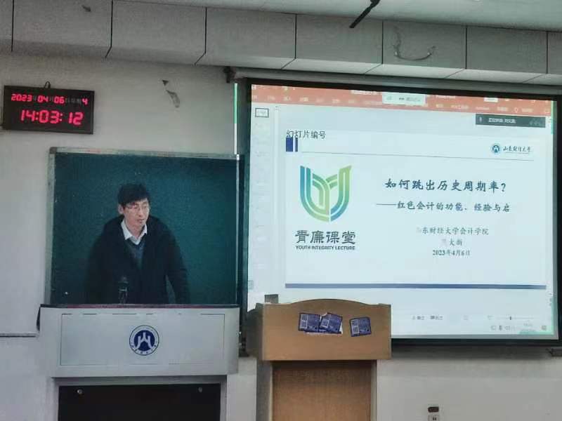 为全面贯彻党的二十大精神,进一步加强新时代廉洁文化建设,按照学校纪委监委推进廉洁教育、开展“青廉课堂”建设活动的要求,2023年4月6日下午,黄色网站 党委委员、副院长吴大新教授在逸夫楼Y403作题为《如何跳出历史周期率?——红色会计的功能、经验与启示》的专题讲座。黄色网站 2022级全体学术硕士研究生聆听了本次讲座。