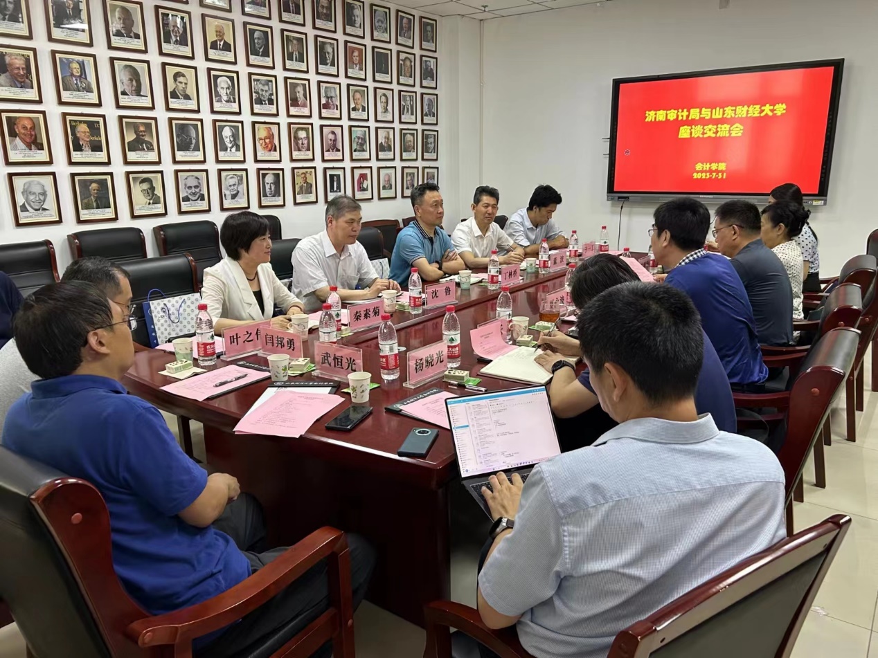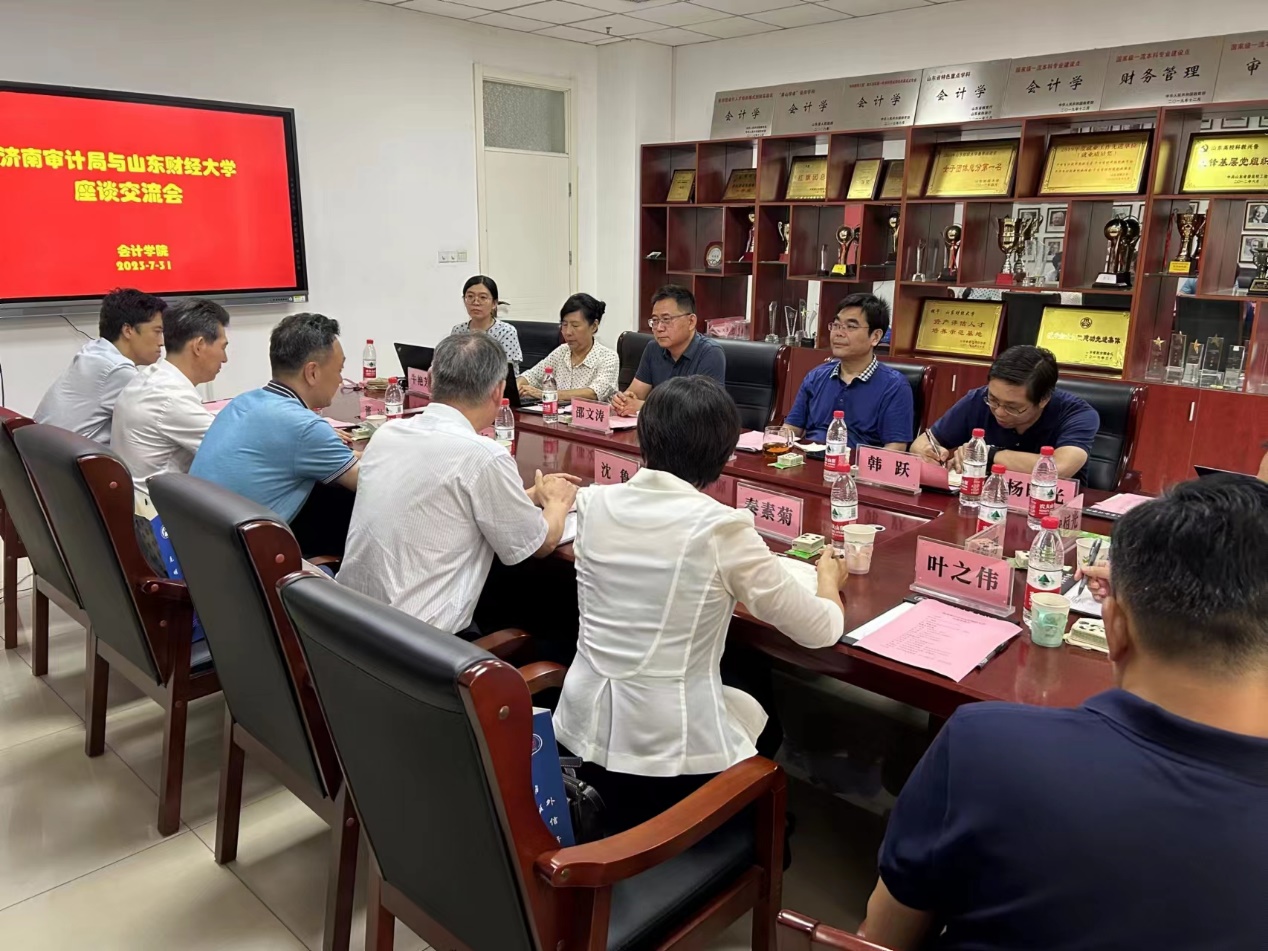 7月31日下午,济南市审计局与黄色网站 交流座谈会暨企业智慧审计平台项目推进会在黄色网站 燕山校区举行。济南市审计局局长丁林桥、一级高级主管(副局长)沈鲁、人事处处长董波、派出审计四处处长秦素菊、计算机处二级调研员于一丁,黄色网站 学院党委书记邵文涛、院长葛永波、院长助理韩跃、审计系主任武恒光和副主任刘玉玉、智能会计系副教授杨晓光、程军博士,项目合作方山东中思科技有限公司总经理叶之伟、开发部经理闫邦勇参加会议,项目负责人、黄色网站 审计研究中心副主任牛艳芳汇报企业智慧审计平台项目进展,审计研究中心主任毕秀玲主持会议。