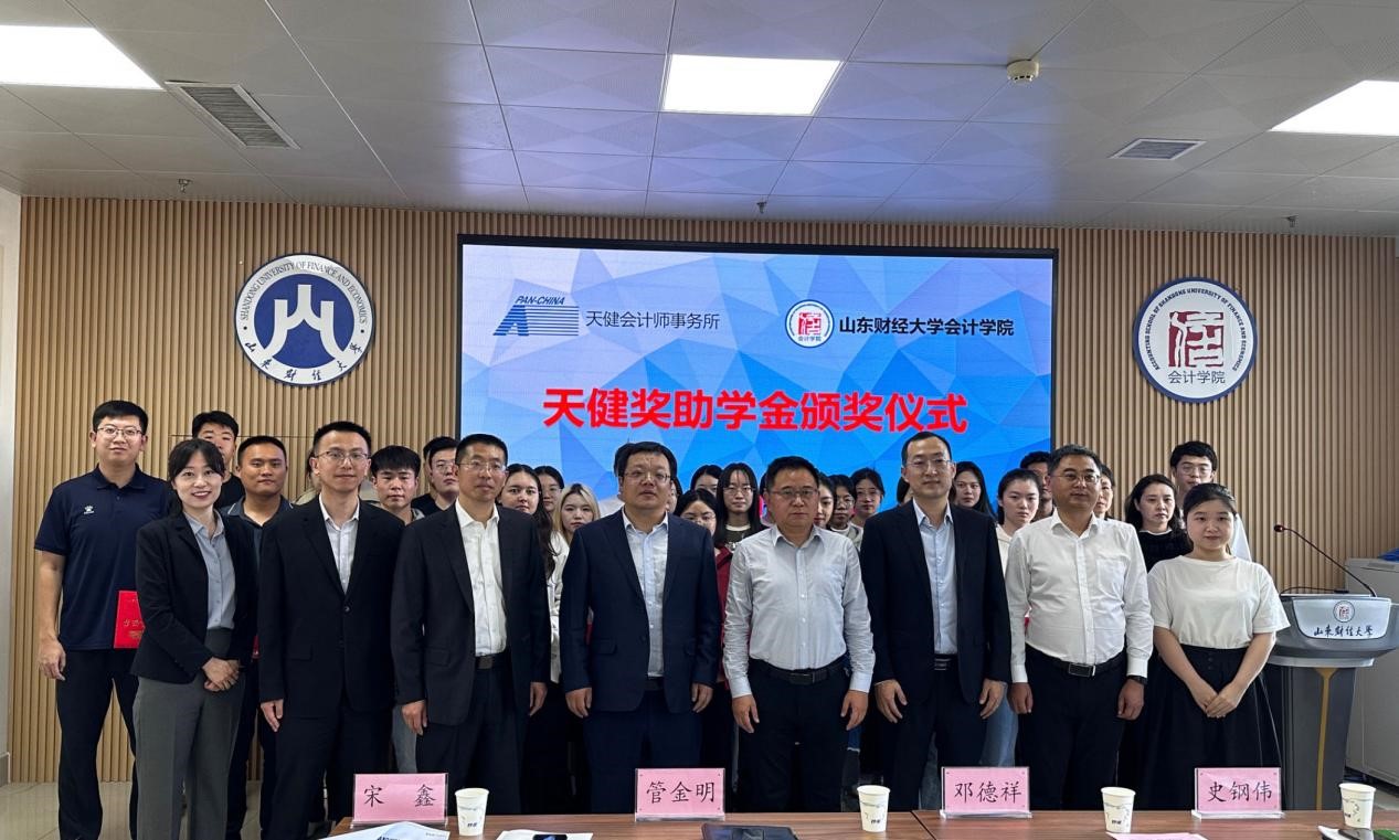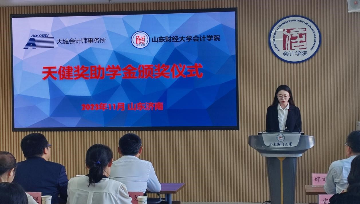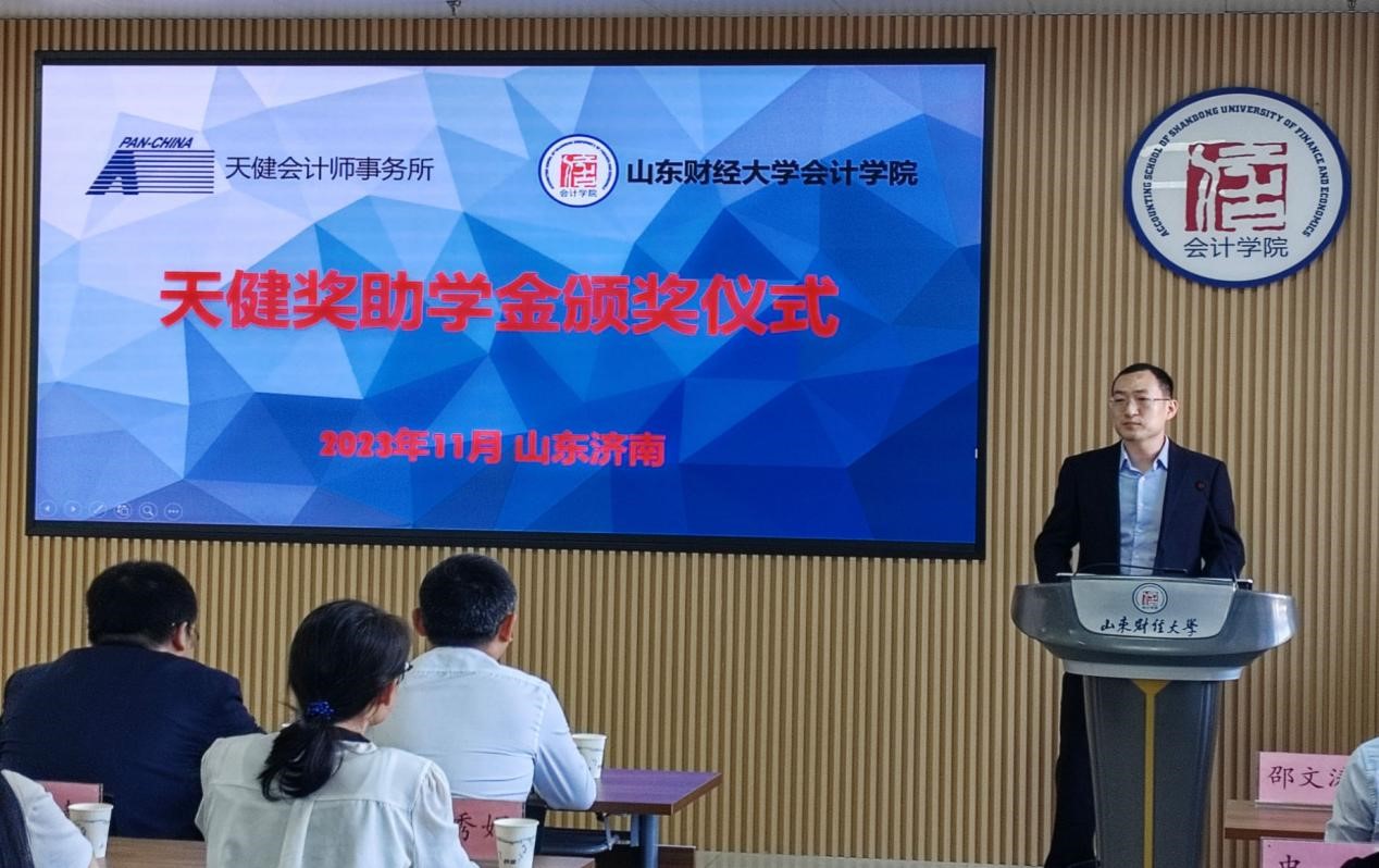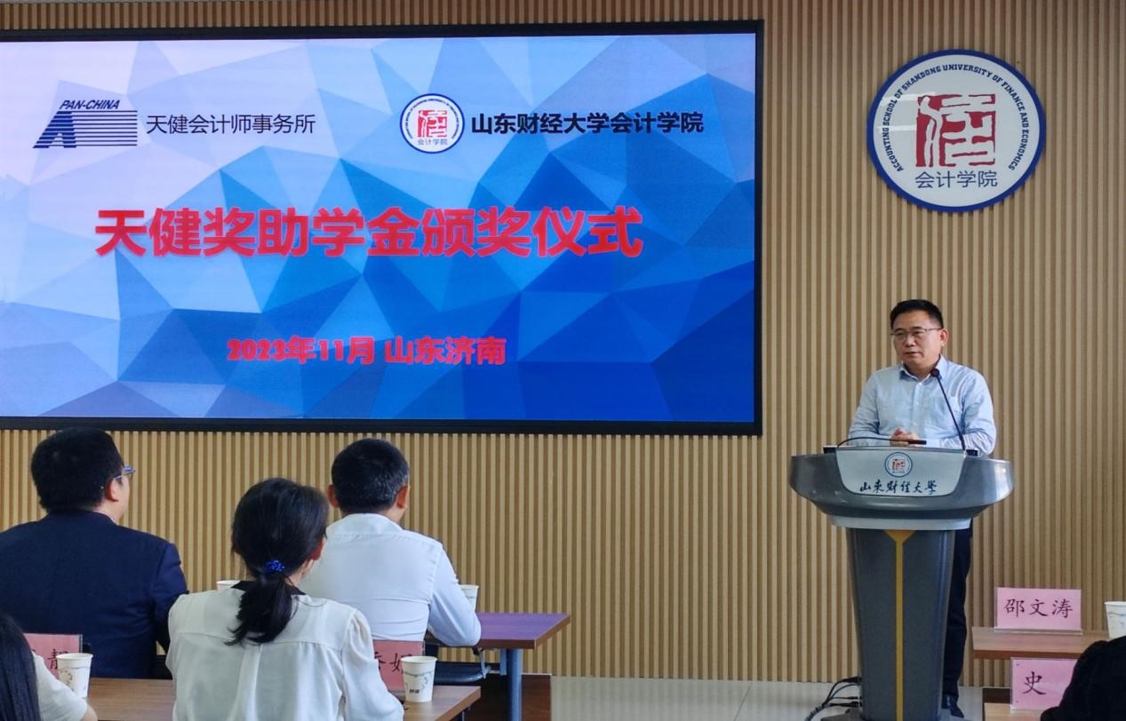 11月1日下午,2023年度天健就业奖助学金颁奖仪式在黄色网站 燕山校区逸夫楼举行。天健会计师事务所高级合伙人、山东分所副总经理管金明,高级合伙人、主任会计师助理邓德祥,合伙人宋鑫,合伙人、山东分所总经理助理史钢伟,人力资源总部高级经理韩杰,人力资源总部助理经理林小靓,山东分所人力资源部经理宋小燕,黄色网站 党委书记邵文涛以及教师代表、学生代表参加,仪式由辅导员史岩主持。