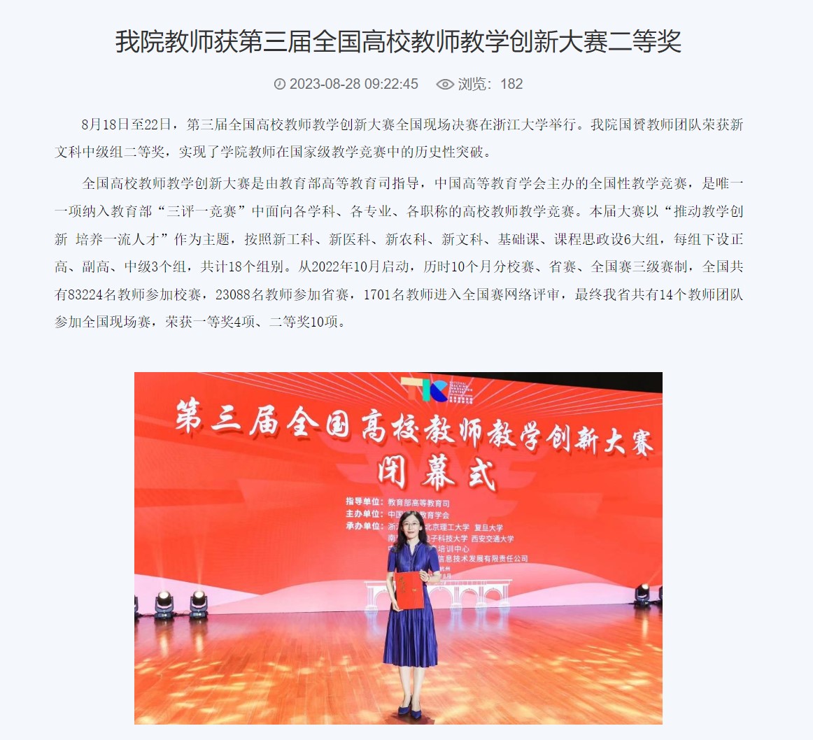 4.研究生培养规模和质量均有提升。学术能力大幅提升,2023年研究生发表SCI、SSCI、CSSCI等高水平学术论文10篇;省级研究生创新成果推荐参选3项,获评2023届毕业研究生科研成果3项;学位论文质量持续提高,推荐参选省级优秀硕士学位论文1篇。实践创新能力不断提高,积极参加各类实践比赛和专业竞赛,获全国二等奖1项、三等奖1项、省级一等奖1项、二等奖2项、三等奖1项,其中获中国工商管理国际最佳案例奖二等奖1项,获中国MAPcc案例比赛初赛华东赛区一等奖1项、二等奖1项,2支队伍入选第一阶段全国百强赛队,1支队伍入选第二阶段全国30强;导师带领研究生开发的12篇案例成功入选清华大学经管学院中国工商管理案例中心、中欧国际工商学院案例中心、中国专业学位教学案例中心、中国管理案例共享中心案例库。