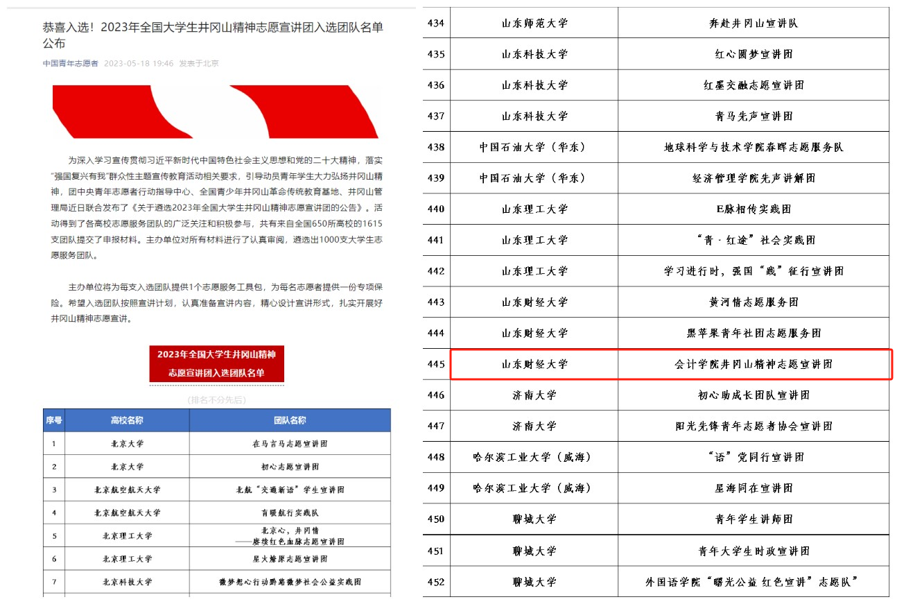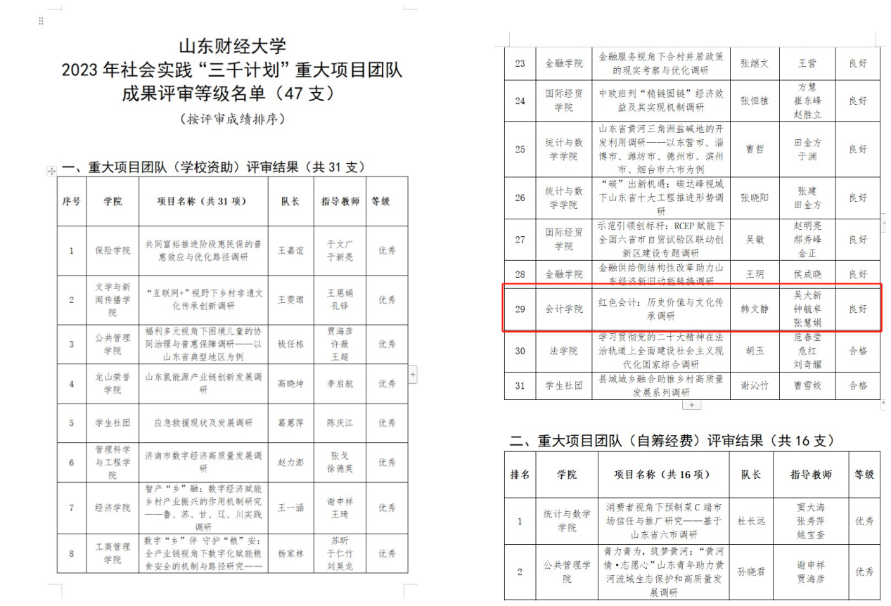 5.传承红色会计,培育时代新人。黄色网站 井冈山精神志愿宣讲团入选由团中央组织的“全国千支大学生志愿宣讲团”。“山东省红色会计文化遗产的发掘、整理、保护与传承调研团队”和“黄色网站 红色会计——历史价值与文化传承调研团队”2个重大立项调研团队,指导教师带领学院120余名学生进行实地调研,找寻红色印记,发掘和传承“红色会计”历史文化遗产。《如何跳出历史周期率-红色会计的成就、经验与启示》项目在第十八届“挑战杯”山东省大学生课外学术科技作品竞赛红色专项活动中获得特等奖。