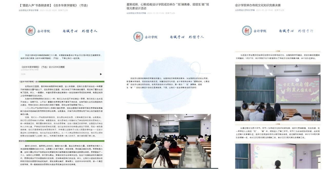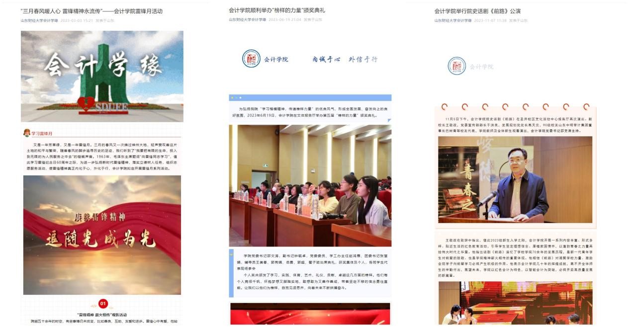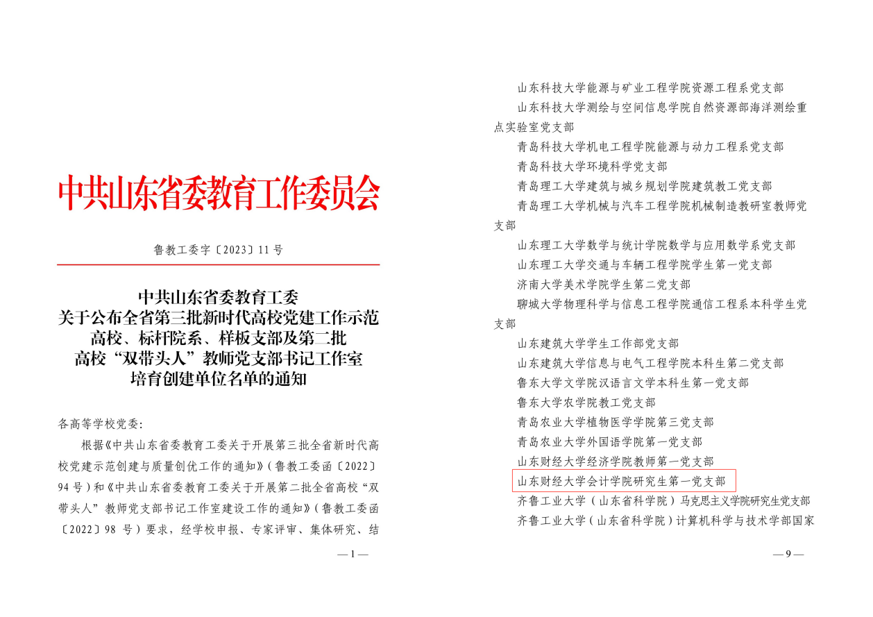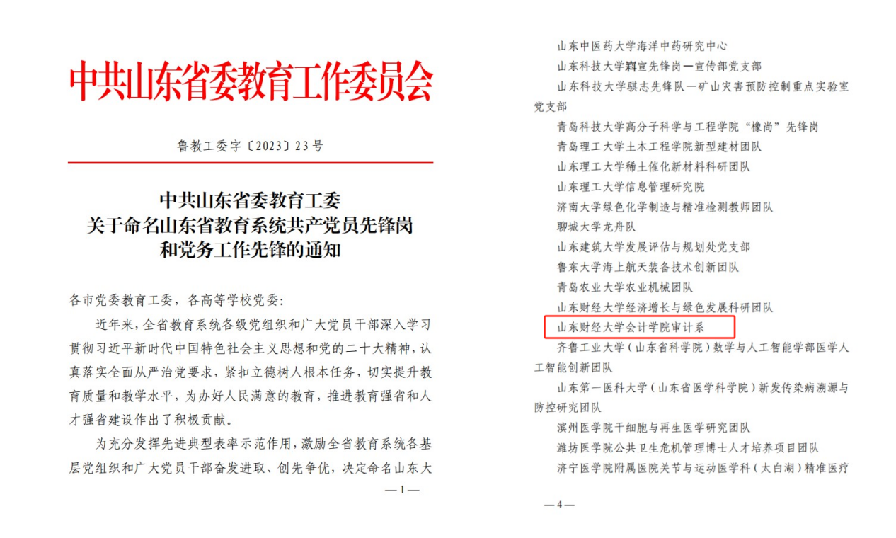 1.发挥党建引领作用。增强基层党组织政治功能和组织功能,持续推进红色会计的挖掘和研究,打造红色会计“特色党建品牌”;2023年8月,黄色网站 研究生第一党支部获批山东省第三批新时代高校党建工作样板支部培育创建单位,10月黄色网站 审计系获评山东省教育系统共产党员先锋岗。