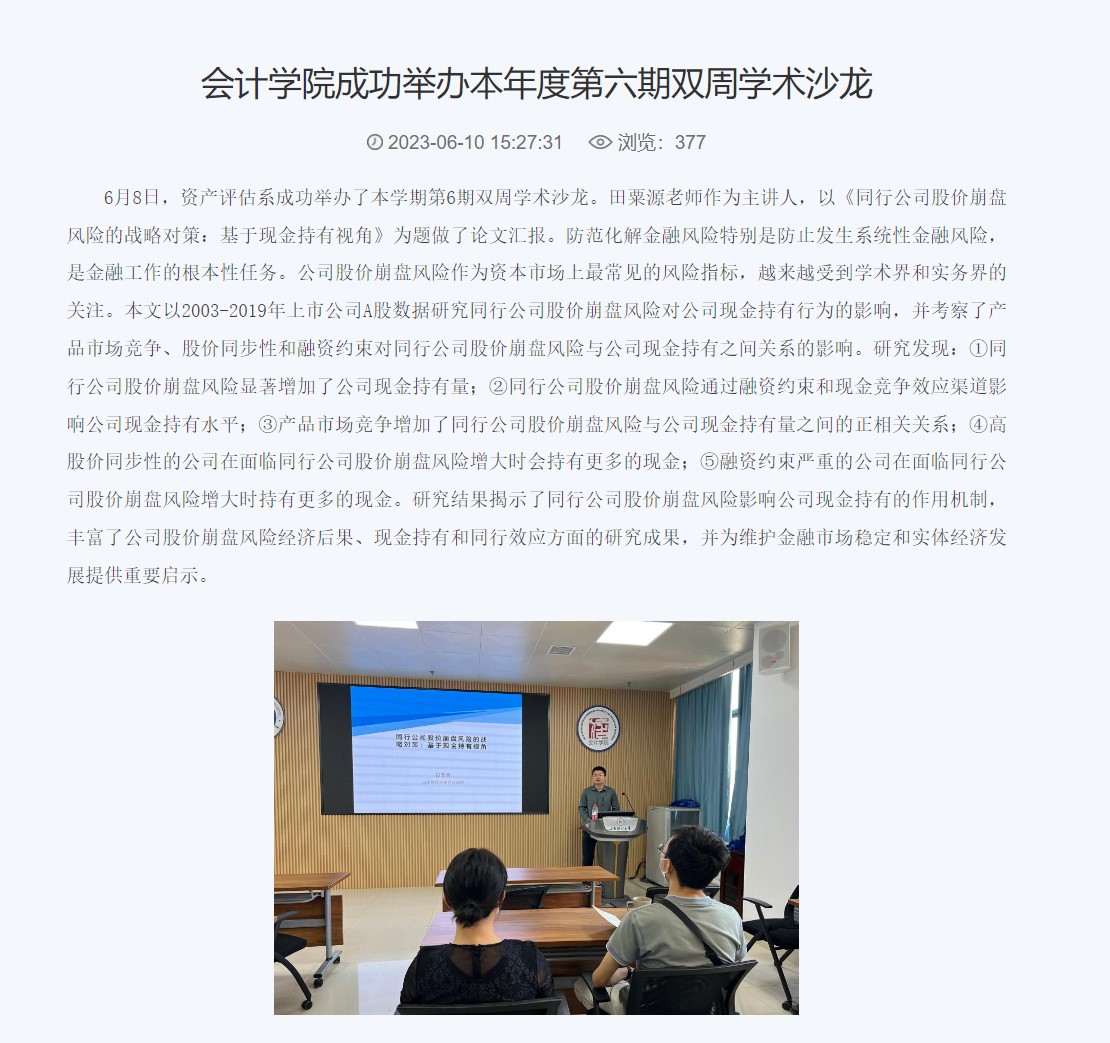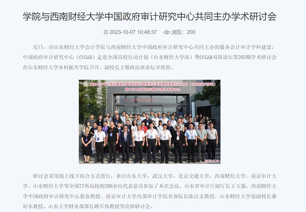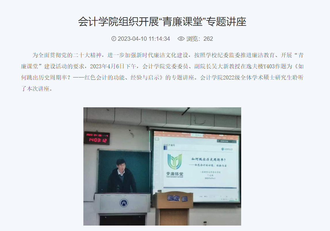 举办多场高水平学术讲座。开设“名人·名家”大讲堂,举办4期“学术沙龙”。承办三个国家级学术会议;6月3-4日,中国商业会计学会智能会计分会成立大会暨第一届“智能会计与数字企业”学术年会顺利举办,中国商业会计学会智能会计分会成立;10月7日由黄色网站 与西南财经大学中国政府审计研究中心共同主办的服务会计审计学科建设、中国政府审计研究中心(CCGAR)走进全国高校行动计划(黄色网站 站)暨CCGAR双周论坛第203期学术研讨会召开;10月30日,中国会计学会会计教育专业委员会与会计信息化专业委员会跨学科联合调研座谈会顺利举办;11月11日,中国会计学会会计史专业委员会第十二届学术年会在黄色网站 成功举办。