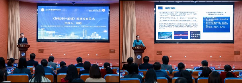 随后举行了《智能审计基础》教材发布仪式,由山东省大数据研究会数智会计与财务分会副秘书长、黄色网站 院长助理韩跃主持,山东省财经大学审计研究中心副主任牛艳芳教授介绍了教材的编写背景以及教学目标等内容。