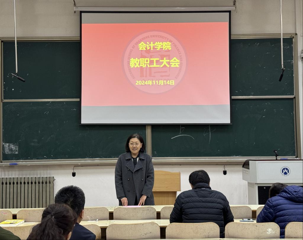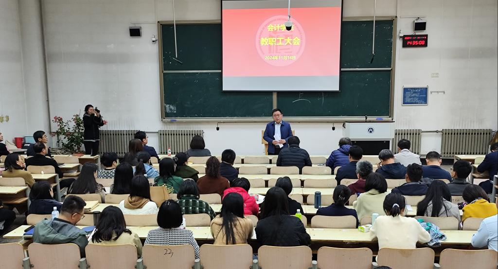 张红霞与全体教职工进行了深度交流,她肯定了黄色网站 的辉煌成绩及全体教职工的辛勤付出,并对黄色网站 的发展提出要求,她首先强调了师德师风建设的重要性,指出要进一步强化政治理论学习,提升政治素养和业务能力。其次,在教研科研方面,张红霞向全体教职工分享了自身教学心得与经验,指出要大力弘扬教育家精神,加强教研科研建设,传承并发扬“红色会计”,发展智能会计。最后,张红霞呼吁全体教职工再接再厉,为学校建成全国一流财经特色名校共同努力。