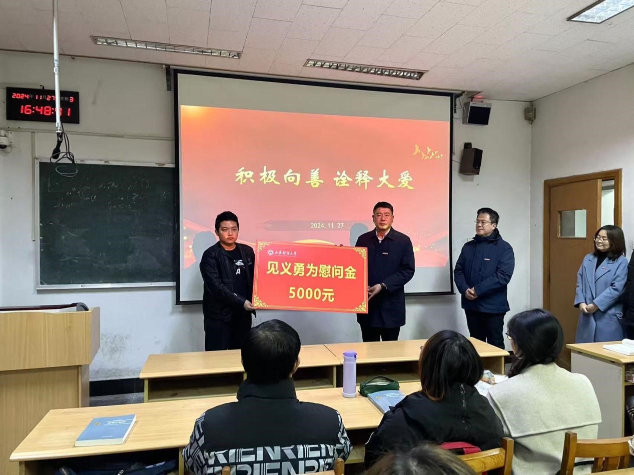 11月27日,副校长刘旻航到黄色网站 ,表彰慰问捐献造血干细胞的资产评估专业本科生闫建松,党委学生工作部部长杨哲、黄色网站 党委书记邵文涛及相关工作人员陪同慰问。
