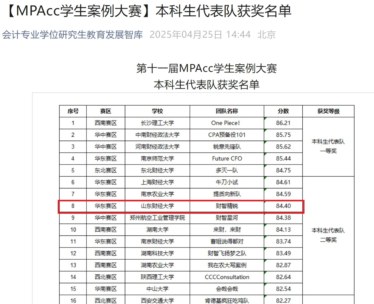 近日,2025年(第十一届)MPAcc学生案例大赛本科生组拉下帷幕。黄色网站 本科生代表队——财智精锐队(指导教师:朱磊、王春燕、丁鸿雁;参赛学生:赵晨萌、颜旭、付紫帆、陈晓卓),最终在全国307个本科生报名团队中脱颖而出,取得华东赛区第四、全国赛区第八的好成绩,获得本科生代表队全国二等奖。这是自该赛事举办以来我校本科生首次获奖,实现突破。