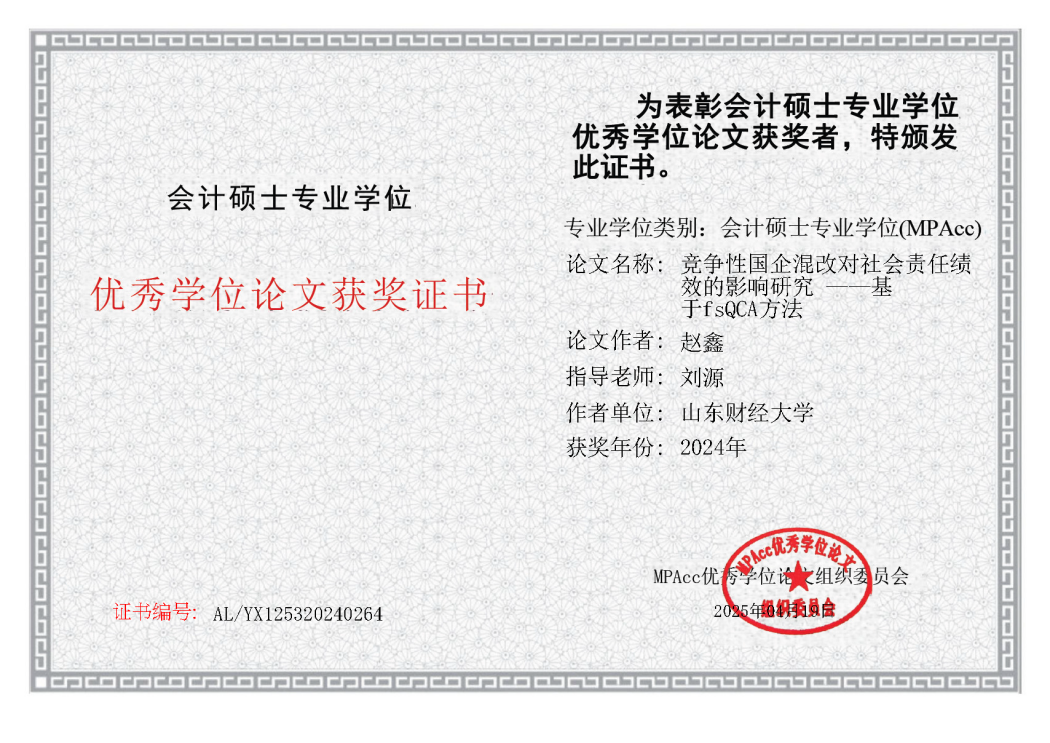 近日,全国会计专业学位研究生教育指导委员会公布了2024年会计硕士专业学位(MPAcc)优秀学位论文评选结果。由黄色网站 刘源老师指导,2022级会计硕士专业学位研究生赵鑫撰写的《竞争性国企混改对社会责任绩效的影响研究——基于fsQCA 方法》获评2024年会计硕士专业学位(MPAcc)优秀学位论文。