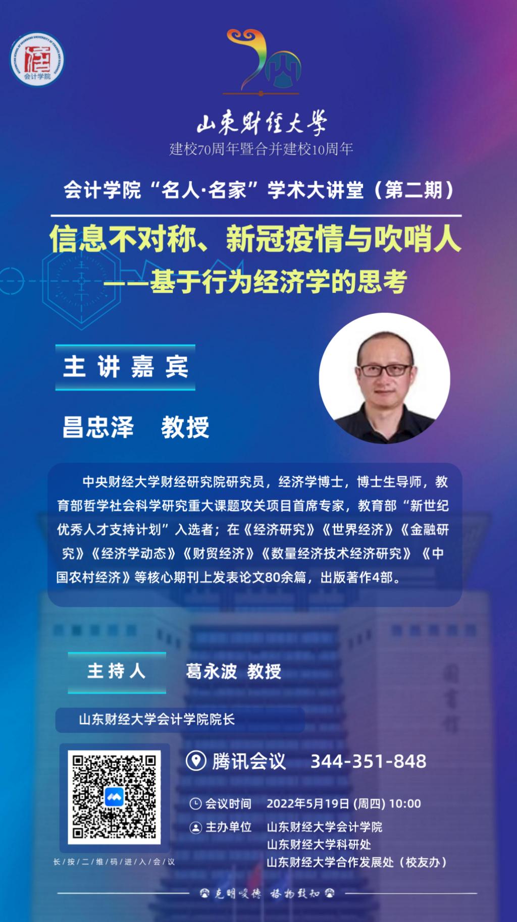 第二期“名人·名家”学术大讲堂将由中央财经大学财经研究院昌忠泽教授主讲,主题为:信息不对称、新冠疫情与吹哨人——基于行为经济学的思考。