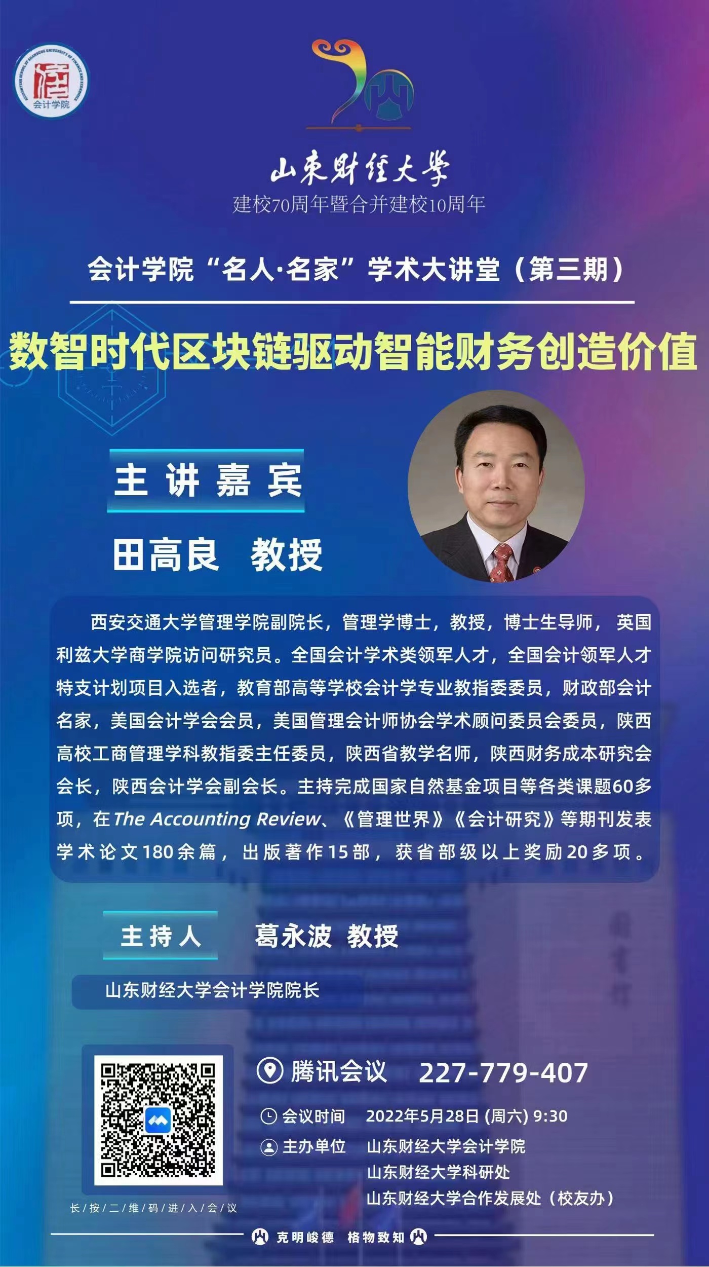 第三期“名人·名家”学术大讲堂将由西安交通大学管理学院副院长田高良教授主讲,主题为:数智时代区块链驱动智能财务创造价值。