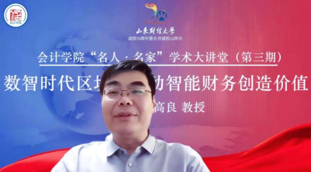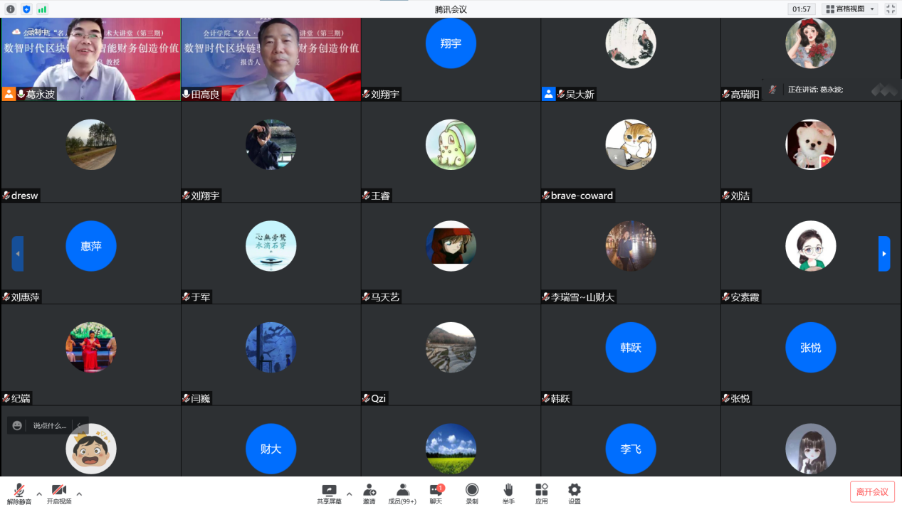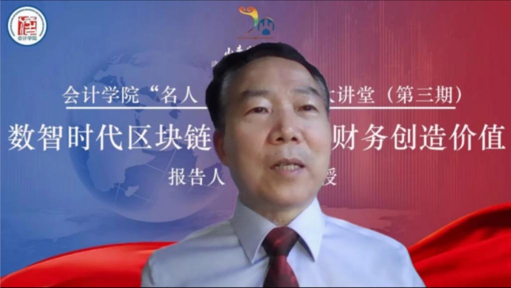田高良教授从“横渠四句”出发,阐明了知识分子的使命意识和责任担当,强调要学习“西迁精神”,胸怀大局、无私奉献、弘扬传统、艰苦创业;随后,以海尔集团为例,介绍区块链驱动智能财务的应用。