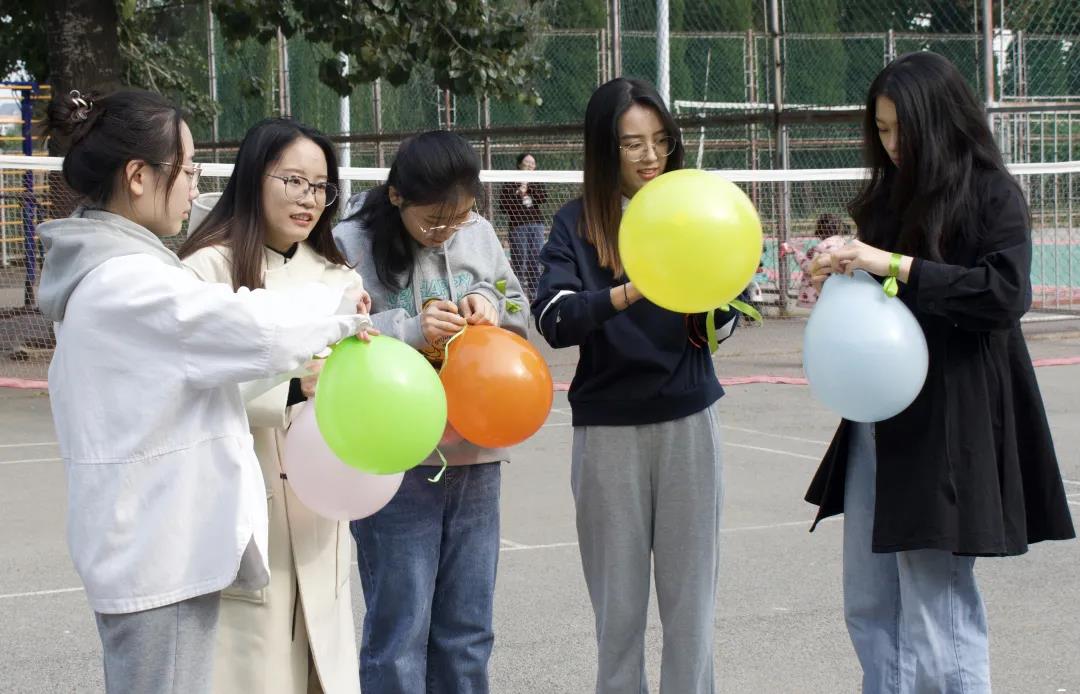 随后进行的第二个游戏是“两人三足踩气球”,这是一个比较激烈且需相互配合的游戏。游戏要求每组出四名同学两两结为一组,将两人相邻的脚绑到一起,四个气球绑到两脚上,进行混战,哪个小组的气球最先被踩完,则该小组被淘汰。游戏非常考验小组成员间的默契和战术配合,同学们都团结一心,为自己的队伍争夺胜利。