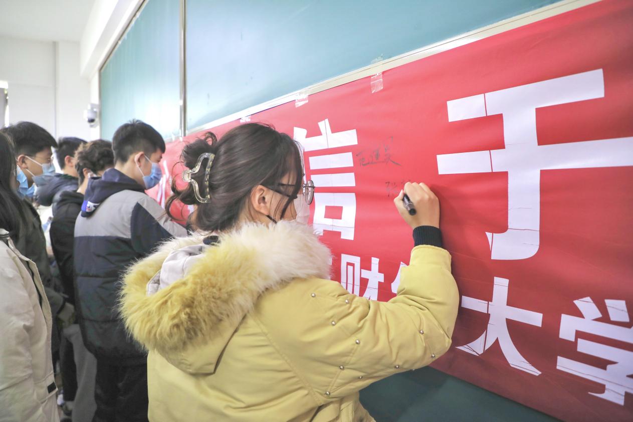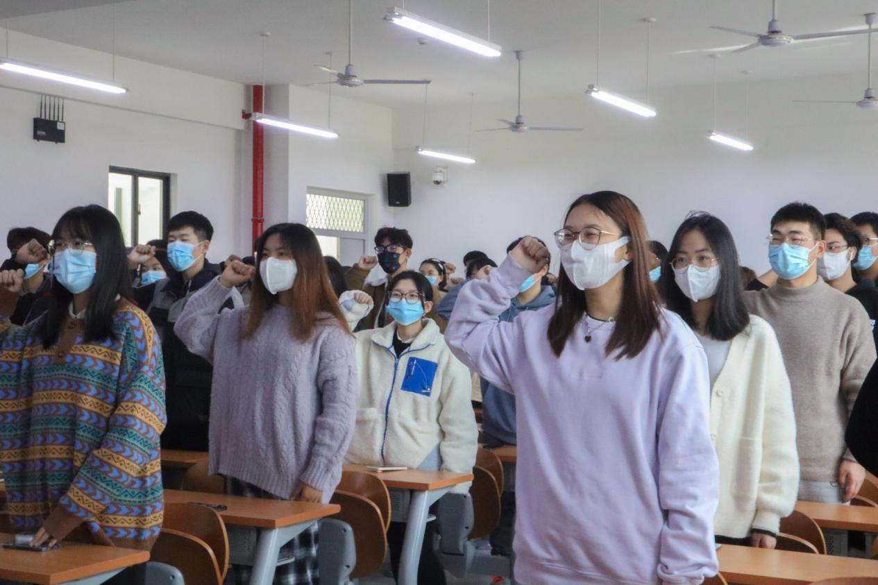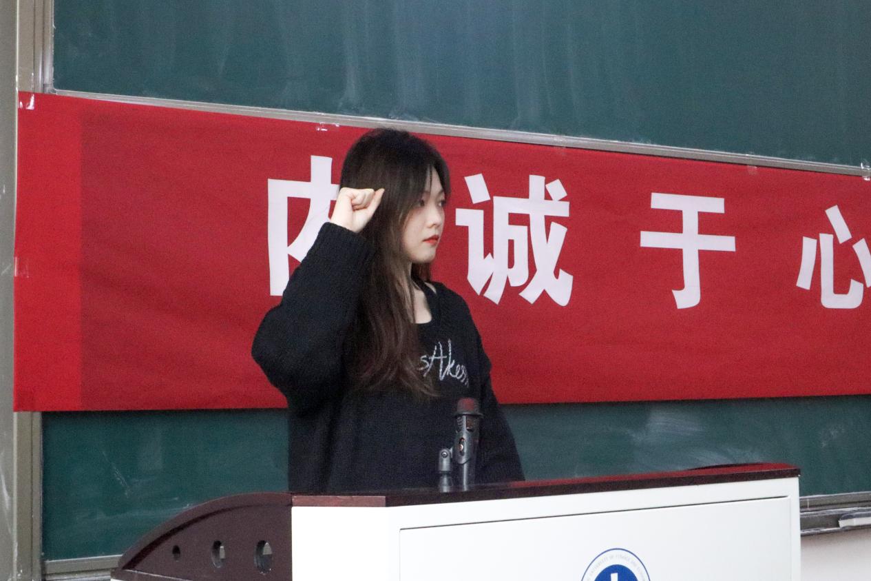 到会同学在杨孙安琪的领誓下,进行了庄严的宣誓:自觉遵守考试纪律,公平参与考试竞争,内诚于心外信于人,弘扬财大优良学风,打造会院诚信品牌。诚信做人诚信考试。做不悔青春的时代好青年!
