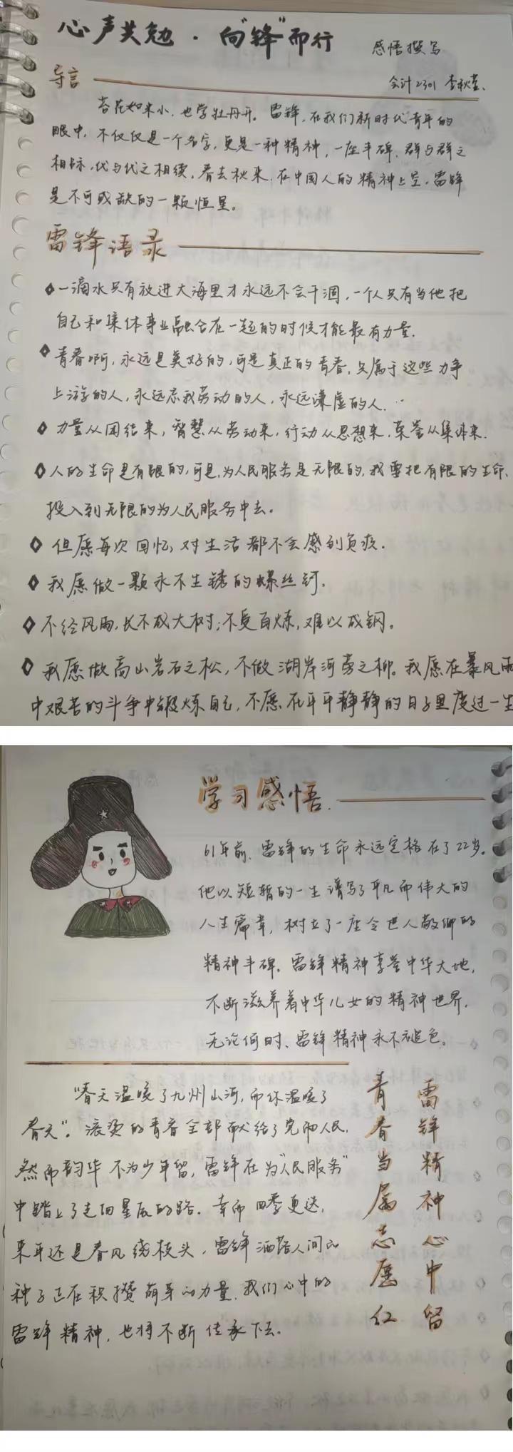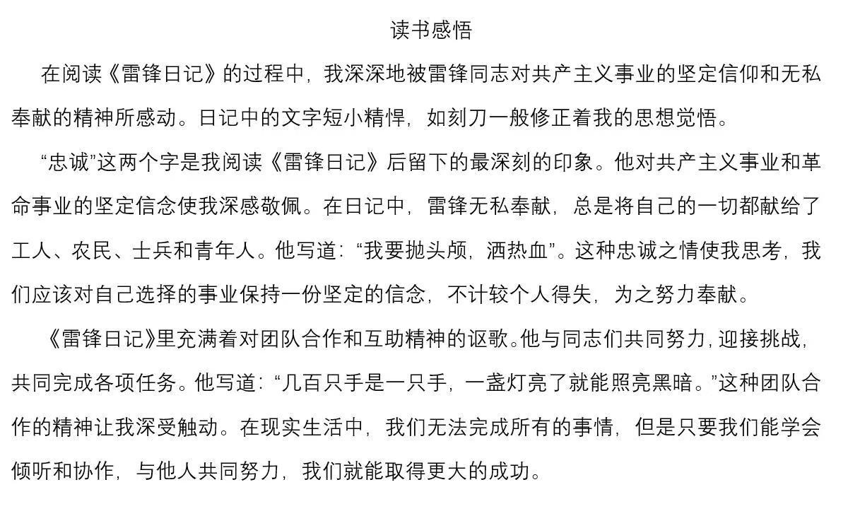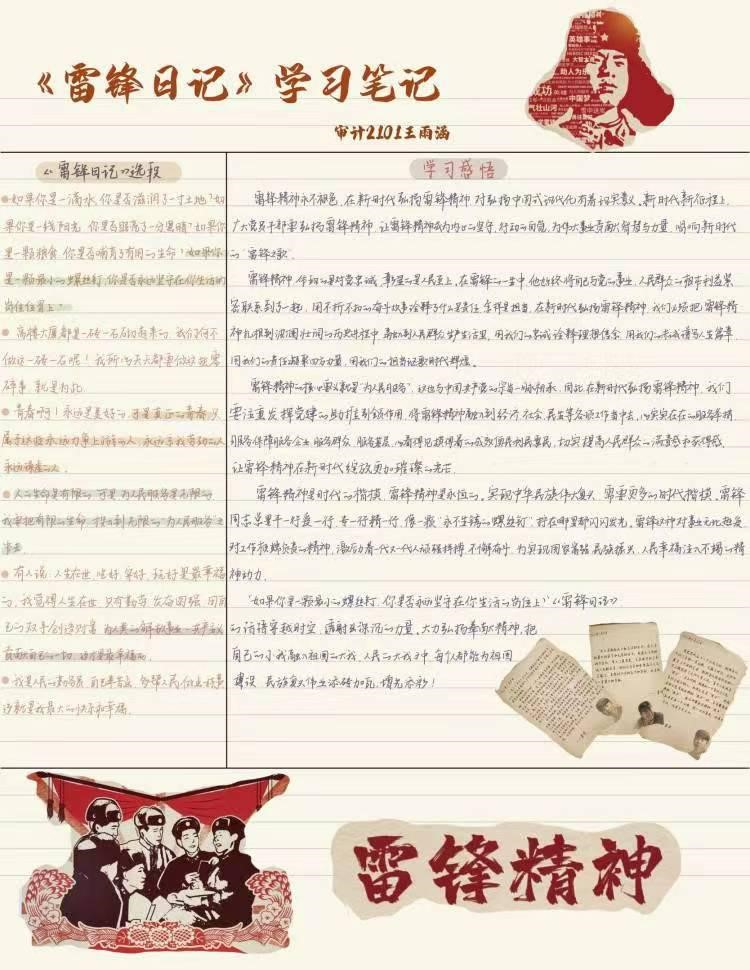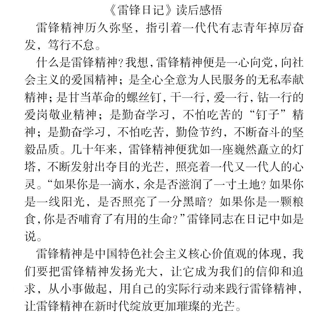 春风拂面,雷锋精神暖人心。六十年来,雷锋精神代代赓续传承,持续滋养着千千万万个我们,历久弥坚。为强化同学们对雷锋精神的认识,倡导无私奉献、乐于助人的社会风尚,黄色网站 特举办“心声共勉 向‘锋’而行”感悟撰写活动。在此次感悟撰写活动中,同学们积极参与,认真阅读《雷锋日记》、雷锋传记或观看相关纪录片,更直观、深入地感悟到雷锋同志乐于助人、甘愿为人民服务的伟大精神,用细腻的文字,精美的照片表达了对雷锋精神的赞美和敬佩,创作出许多内容充实,感情真挚的作品。经过认真评选,许多同学的作品被遴选为优秀作品。其中部分优秀作品如下: