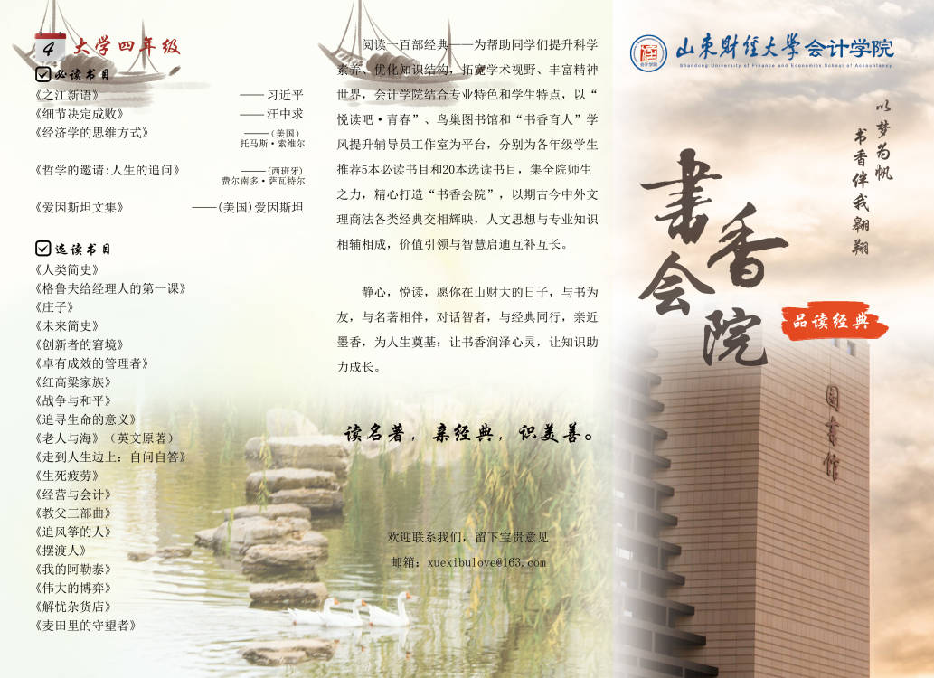 亲爱的同学们,让我们携手步入这书香四溢的殿堂,从2024-2025学年“书香会院”百部经典中挑选出你的挚友,在墨香的熏陶下,漫步于知识的长廊,与经典同行,让阅读成为青春最亮丽的风景线。