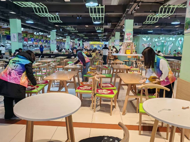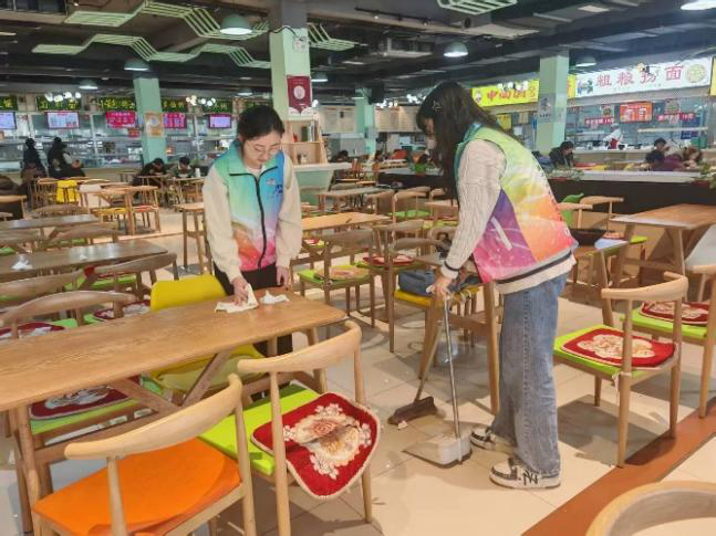 食堂中,志愿者协助工作人员擦拭餐桌、整理餐具,倡导“光盘行动”,引导同学们文明用餐、节约粮食,整洁的食堂环境成为校园文明的展示窗口。